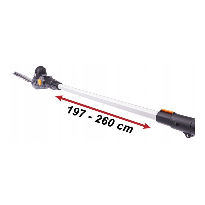 Wysięgnik teleskopowy można regulować w zakresie od 197 cm do 260 cm, co pozwala na dostosowanie narzędzia do różnych warunków pracy. Dzięki temu użytkownik może łatwo dotrzeć do trudno dostępnych miejsc, co znacznie ułatwia prace ogrodowe.
