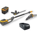 MT 500e charakteryzuje się ergonomicznym kształtem, co zapewnia komfort podczas pracy. W zestawie znajduje się akumulator litowo-jonowy o pojemności 2,0 Ah oraz ładowarka. Długość ostrza tnącego wynosi 440 mm, a maksymalna średnica ciętych gałęzi to 28 mm.