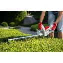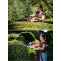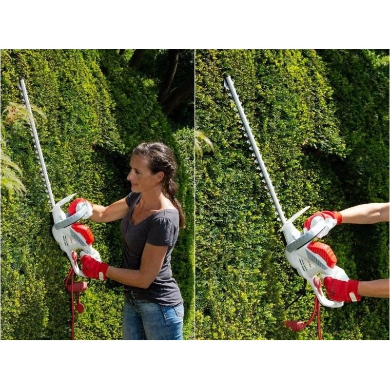 Elektrycznymi nożycami do żywopłotu można sprawnie pracować w ciągły sposób ponieważ energia jest w ciągły sposób dostarczana z gniazdka elektrycznego. Dzięki zewnętrznemu źródłu energii nożyce elektryczne są wyraźnie lżejsze od nożyc spalinowych. Energia dostarczana z gniazdka oznacza także, że nie musisz zwracać uwagi na czas ładowania akumulatora. Nie powstaną też przerwy w pracy spowodowane napełnianiem zbiornika i przygotowywaniem mieszanki. Elektryczne nożyce do żywopłotu IHT 550 posiadają metalową przekładnię co zapewnia niezawodność i trwałość urządzenia. W przypadku żywopłotów rosnących przy murze nie musisz się martwić, że uderzenie końcówką ostrzy w mur uszkodzi nożyce, ponieważ zostały one wyposażone w osłonę ostrzy zamontowana na ich końcówce. Dzięki temu dotkniecie muru końcówką ostrzy ich nie uszkodzi oraz zapobiega to odbiciu nożyc przez poruszające się ostrza. Osłona końcówki ostrzy pełni 3 ważne funkcje: chroni operatora przed odbiciem nożyc, chroni ostrza przed zniszczeniem oraz chroni mur przed uszkodzeniem.