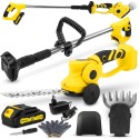 - W zestawie: nożyce, teleskopowa tyczka, ostrze do trawy, ostrze do żywopłotu, akumulator, ładowarka, zestaw osłon, rękawice ochronne