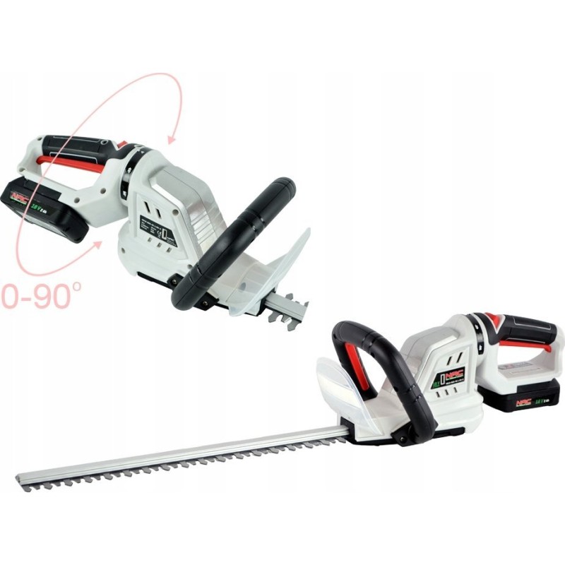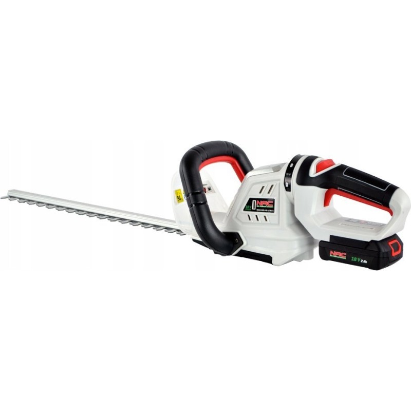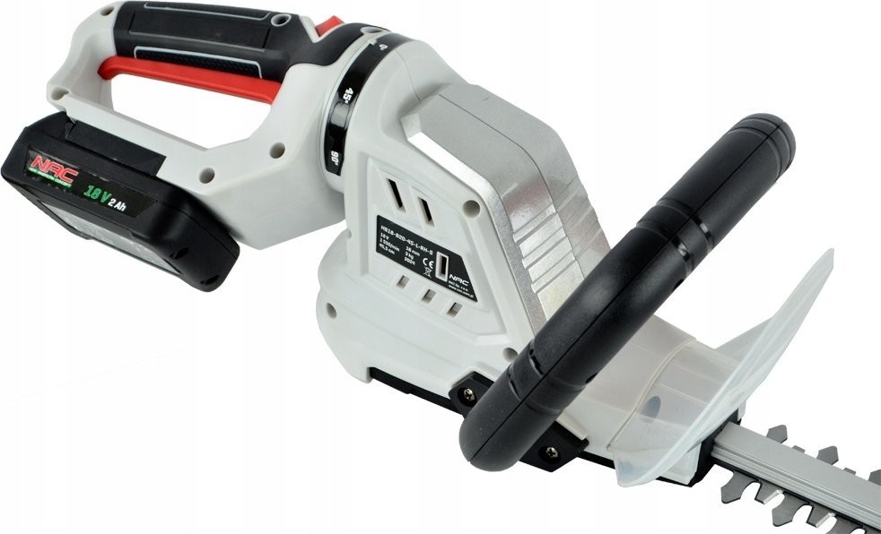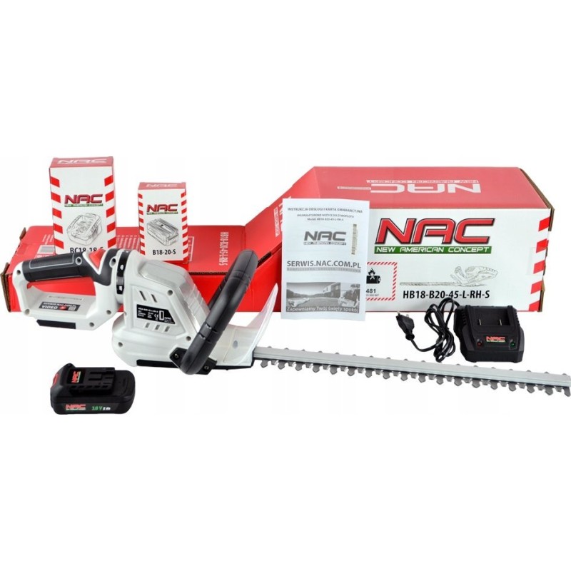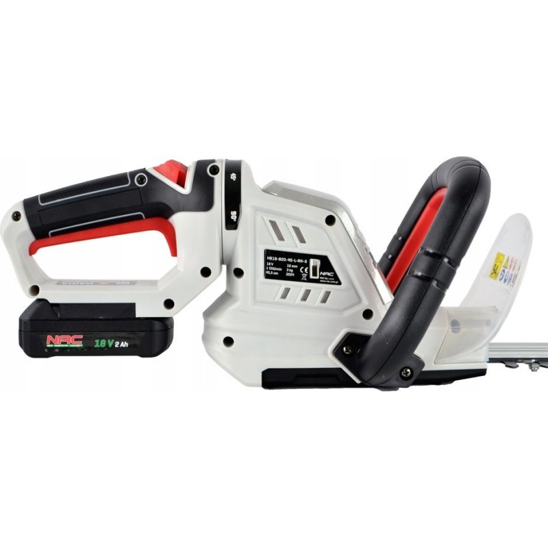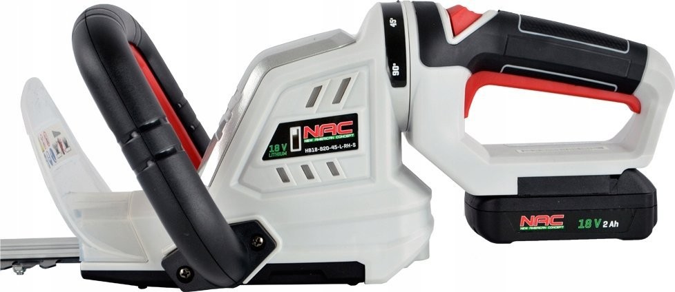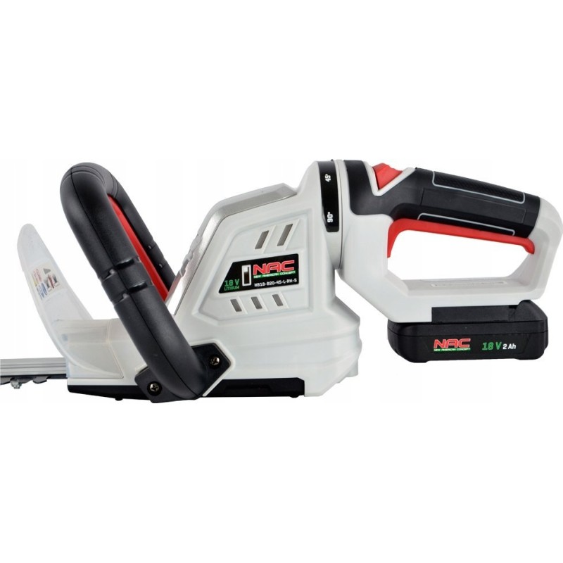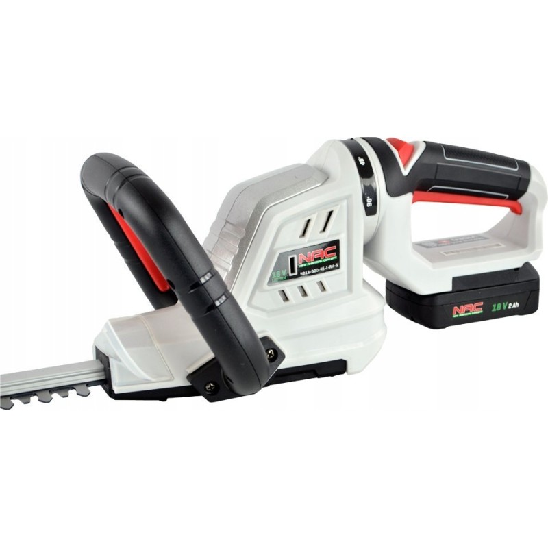 Akumulatorowe nożyce do cięcia żywopłotów i krzewów firmy NAC. Model o symbolu HB18-B20-45-L-RH-S został wyposażony w nowoczesny akumulator litowo-jonowy o napięciu 18 V oraz zwiększonej pojemności do 2 Ah.
