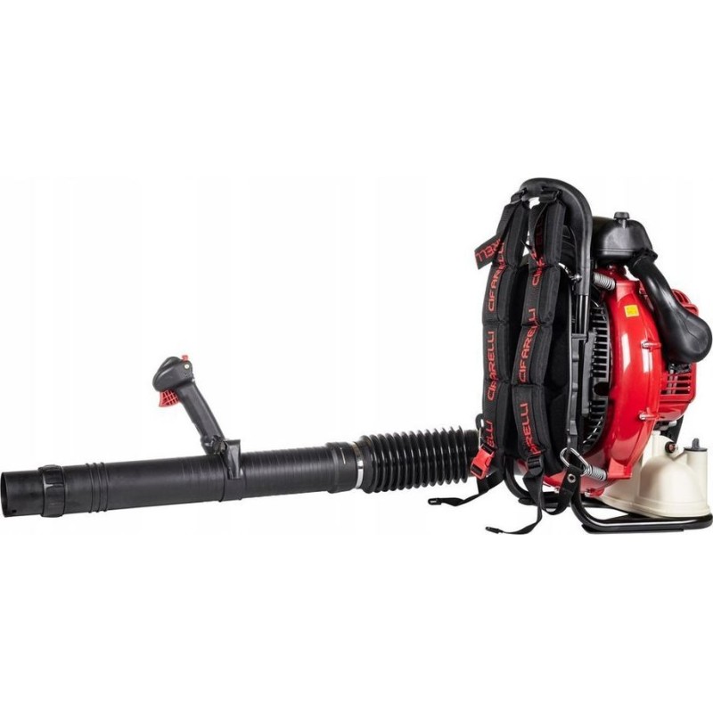 Dmuchawa do liści spalinowa firmy Cifarelli napędzana jest dwusuwowym silnikiem o pojemności 77 cm3 generującym prędkość powietrza na wylocie na poziomie 103 m/3. Silnik o mocy 5 KM zapewnia wystarczającą moc wydmuchiwania powietrza, do usuwania cięzkich zabrudzeń, zakurzeń, usuwanie nie tylko liści, ale i innych cięższych odpadków. Dmuchawa tego typu stosowana jest również amatorsko do czyszczenia maszyn, urządzeń czy innych przedmiotów.