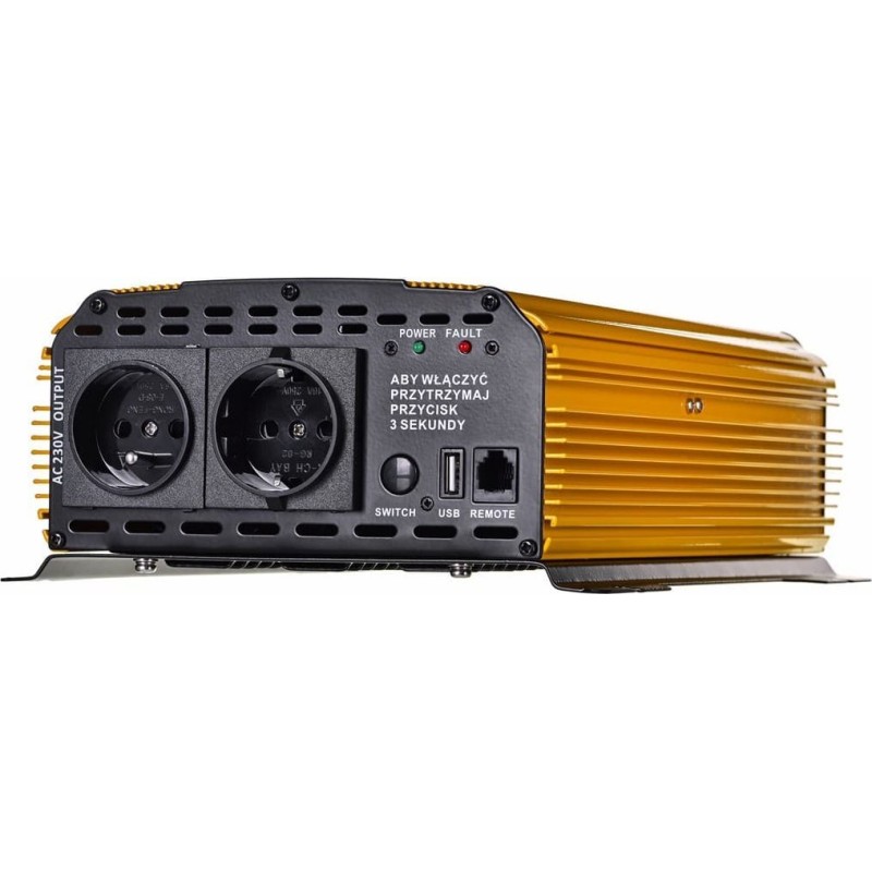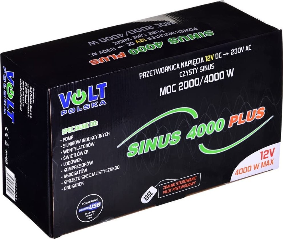 Elektroniczna przetwornica SINUS PLUS 4000 12V służy do zasilania urządzeń elektrycznych wymagających napięcia przemiennego 230V z akumulatorów i instalacji samochodowych o napięciu stałym 12V. Doskonale sprawdza się w pojazdach (np. kampery) i w miejscach gdzie nie ma możliwości bezpośredniego podłączenia do sieci energetycznej. Najważniejsze cechy: 1.Przetwornica typu czysty SINUS wytwarza na wyjściu napięcie o „przebiegu sinusoidalnym”, takie samo jak w sieci energetycznej. Dzięki temu, może zasilać urządzenia o charakterze indukcyjnym m.in. elektronarzędzia siłowe, sprężarki powietrza, klimatyzatory, lodówki, zamrażarki etc.2.Wersja PLUS oferuje dodatkowo panel sterowania wraz z przewodem, który można podłączyć do przetwornicy i uruchamiać ją zdalnie za pomocą przycisku znajdującego się na panelu3.Możliwość podłączenia paneli fotowoltaicznych poprzez regulator napięcia MPPT lub PWM Jakie urządzenia zasila SINUS PLUS 4000 12V?1.Kampery2.Lodówki, zamrażarki3.Klimatyzatory4.Urządzenia RTV np. telewizory, konsole, głośniki etc.5.Oświetlenie LED6.Automatyka domowa i urządzenia typu smart home7.Elektronarzędzia np. wiertarki, szlifierki, kątówki etc.8.Urządzenia AGD np. pralki, mikrofalówki etc.9.Pompy CO