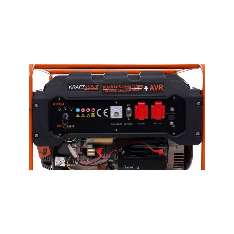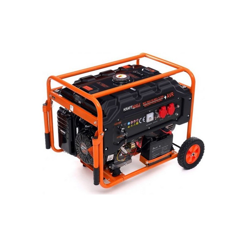 Przenośny agregat prądotwórczy jednofazowy o oznaczeniu KD164 marki Kraft&Dele przeznaczony jest do generowania prądu zmiennego 220V-230V za pomocą silnika spalinowego japońskiej konstrukcji OHV 4-suwowego o mocy 15KM/10,3KW oraz mocy nominalnej prądnicy 5000W.