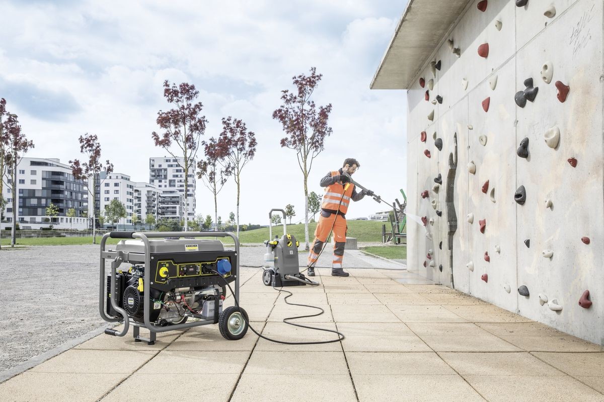 Generator 230 V niezawodnie zapewnia ciągłą moc 2,8 kW. Mocny silnik benzynowy zapewniający co najmniej 6,5 godziny pracy na jednym baku paliwa. - Obsługuje urządzenia wysokociśnieniowe Kärcher