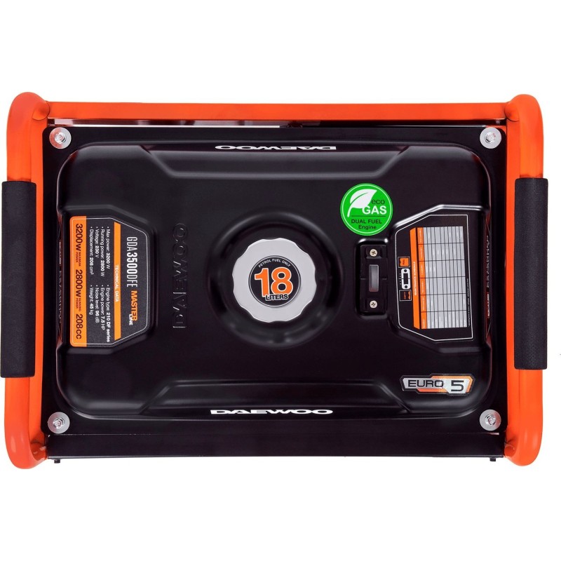 Agregat Daewoo GDA 3500 DFE wyróżnia się na tle innych, gdyż posiada podwójny układ paliwowy Dual Fuel. Co nam to daje? Możemy oprócz zasilania agregatu benzyną wykorzystać jako źródło zasilania mieszankę gazu propan/butan. Gaz w większości jest utleniany w komorze spalania silnika, zatem podczas pracy emitowana jest mniejsza ilość szkodliwych spalin. Taki układ paliwowy pozwala na dłuższą żywotność silnika aż 1,5 - krotnie. Oczywiście koszty eksploatacji agregatu dwupaliwowego względem agregatu benzynowego to około 50%.