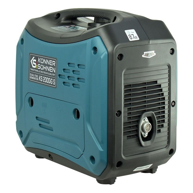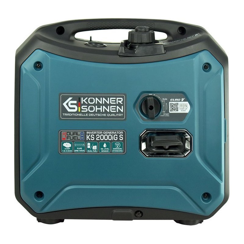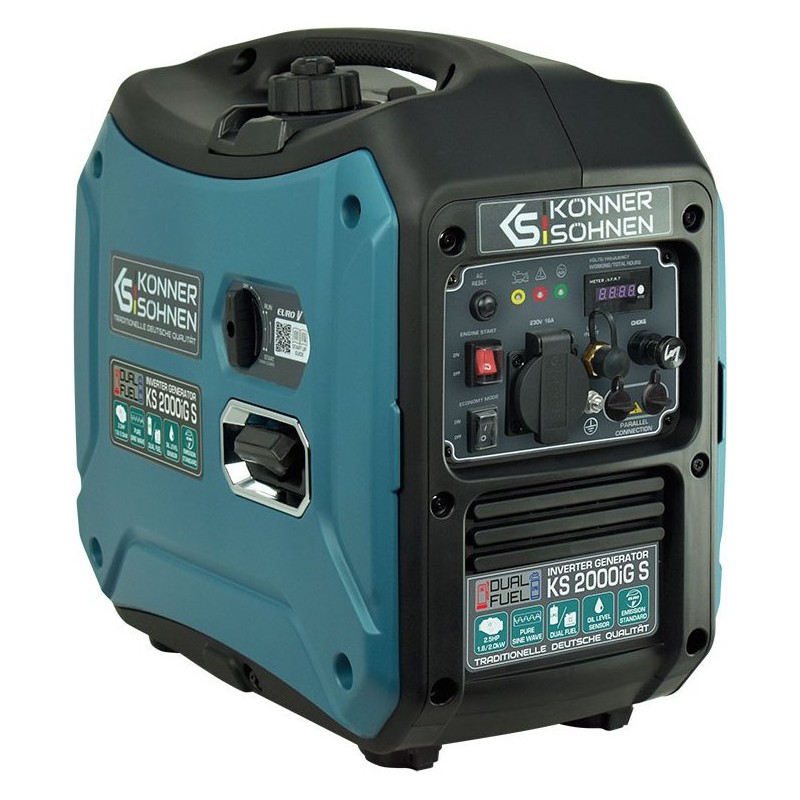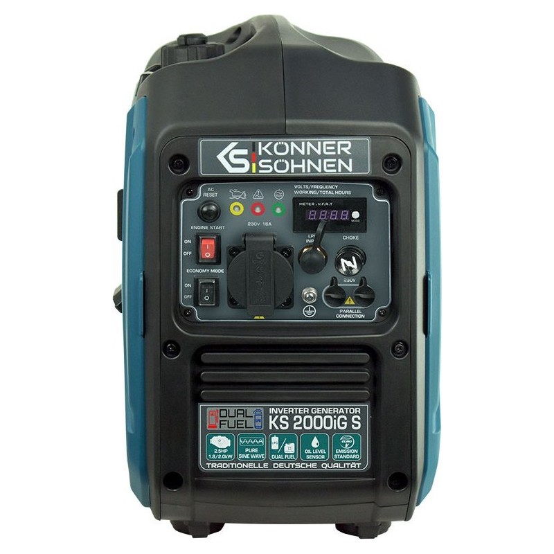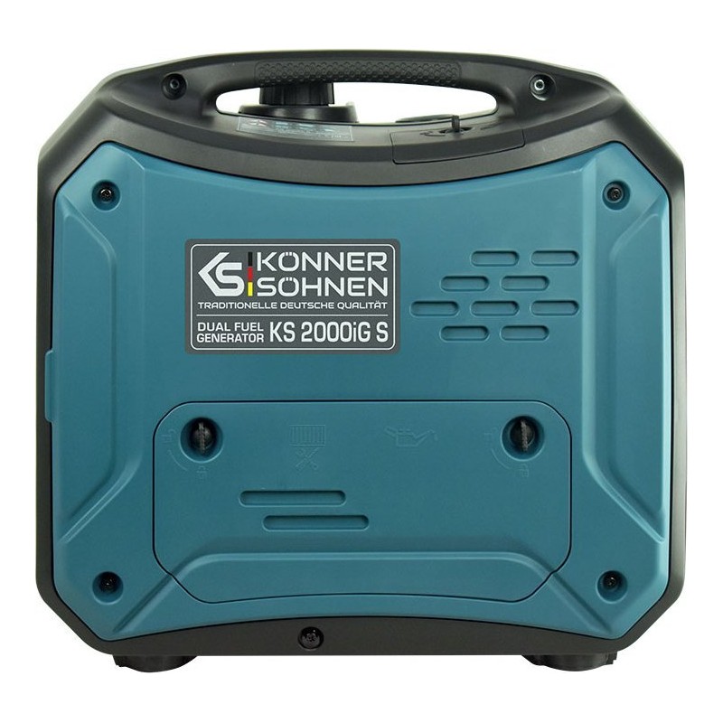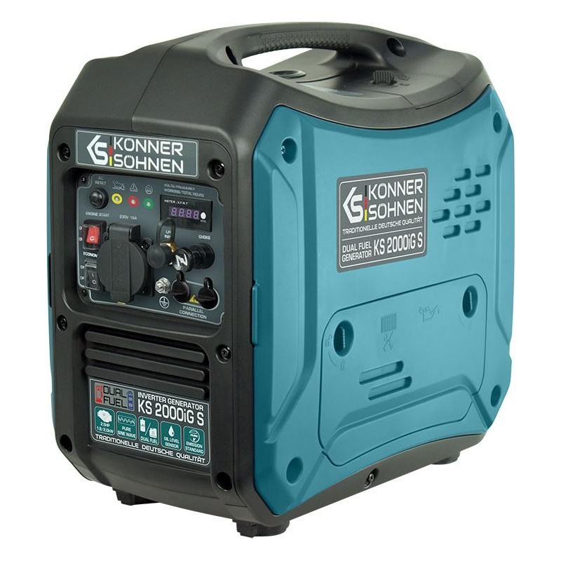 Inwertorowy generator gazowo-benzynowy Könner & Söhnen KS 2000iG S niemieckiej marki Könner & Söhnen to wygodne, kompaktowe, prawie bezgłośne źródło energii elektrycznej. Kluczową cechą tego modelu jest to, że wytwarza prąd elektryczny o prawidłowej fali sinusoidalnej.