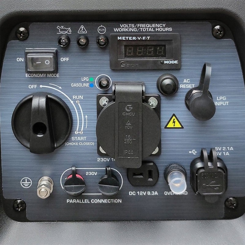Ergonomiczny panel sterujący wyposażony jest w: wyświetlacz LED, gniazdo 16 A, dwa porty USB 5V/1A, 5V/2.1A, przełącznik trybu ekonomicznego, wskaźniki stanu pracy, złącze do równoległego podłączenia generatorów w celu uzyskania podwójnego zasilania oraz przycisk RESET do ponownego uruchomienia systemu sterowania (w przypadku zadziałania wyłącznika) i przywrócenia napięcia zasilającego.
