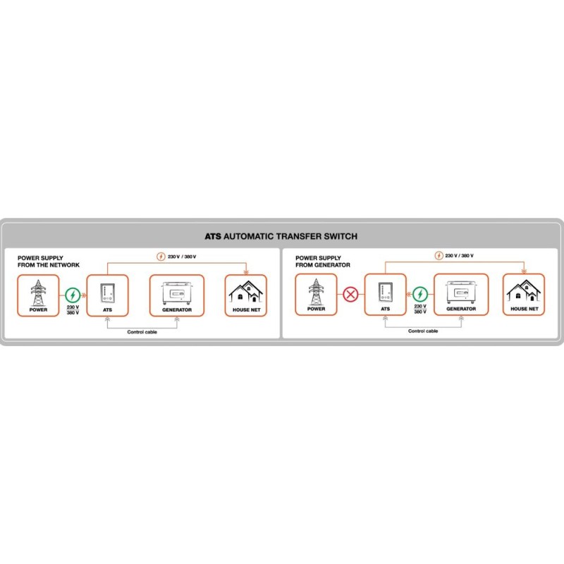 W przypadku zaniku zasilania lub spadku napięcia w sieci podstawowej moduł uruchamia agregat prądotwórczy. Po wznowieniu dostarczania energii elektrycznej następuje przełączenie powrotne na tor zasilania podstawowego, a agregat zostaje wyłączony i przechodzi w tryb czuwania. Moduł także stale monitoruje napięcie akumulatora rozruchowego agregatu i w razie potrzeby załącza ładowanie. Urządzenie posiada wygodne montażowe uchwyty ścienne oraz solidną, metalową obudowę zamykaną na klucz.