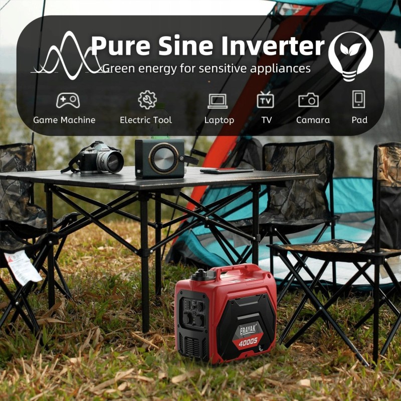 Agregat prądotwórczy ERAYAK EYG4000S generuje czystą falę sinusoidalną, co czyni go idealnym do zasilania wrażliwych urządzeń elektronicznych, takich jak laptopy, telefony, lodówki czy klimatyzatory. Dzięki różnorodnym opcjom wyjściowym, w tym dwóm gniazdom 230 V, gniazdu 12 V DC oraz dwóm portom USB 5 V 2,1 A, można zasilać wiele urządzeń jednocześnie, co zwiększa jego funkcjonalność.