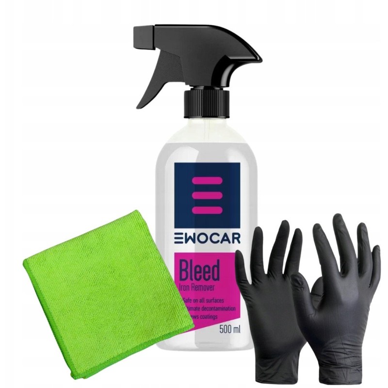 Zestaw zawiera: Ewocar Bleed 500ml, mikrofibrę i rękawiczki