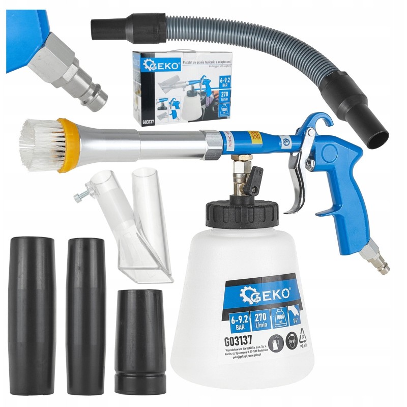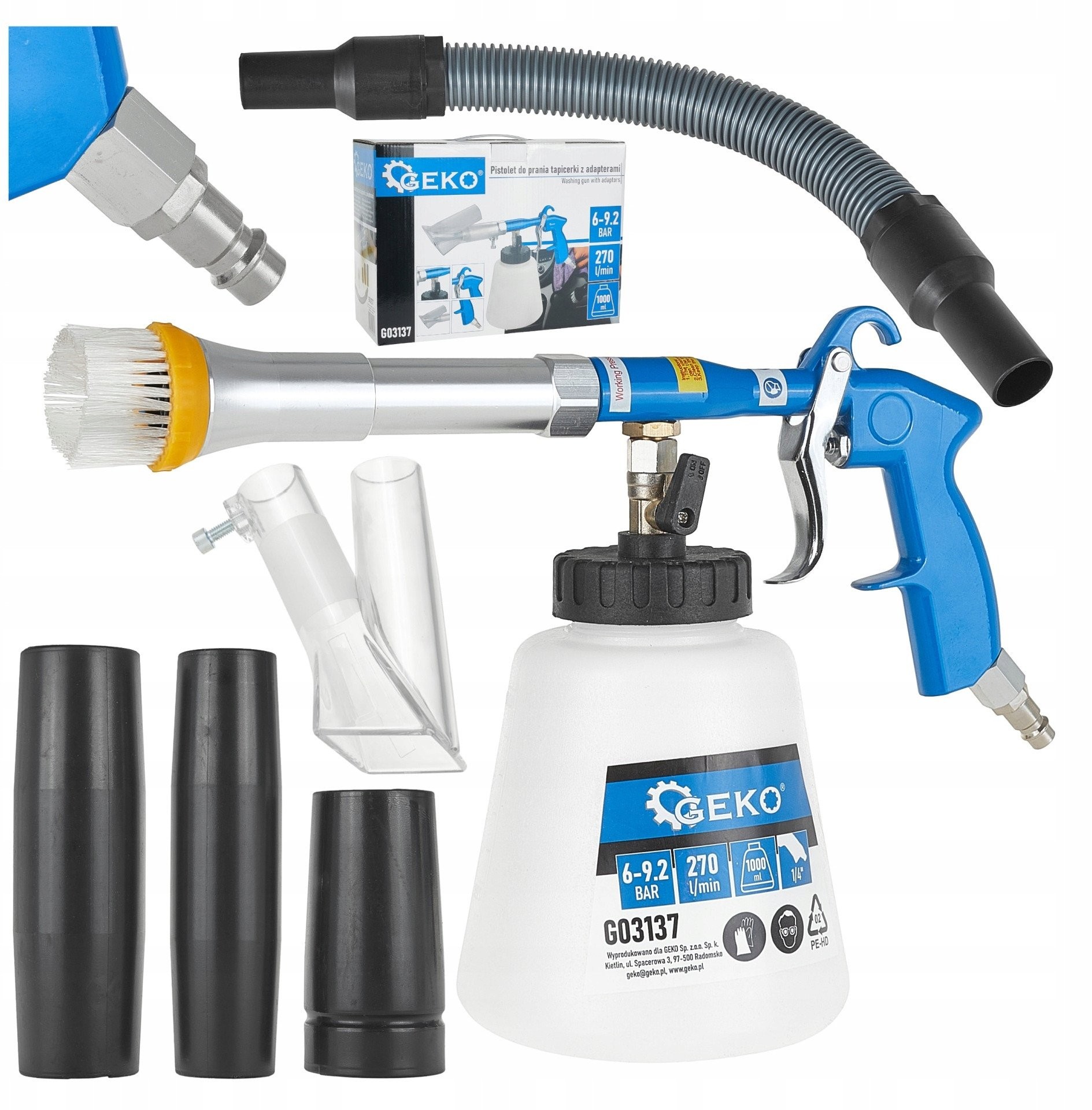 Pistolet do prania tapicerki GEKO jest wyposażony w różnorodne adaptery, które pozwalają na dostosowanie urządzenia do różnych powierzchni. Dzięki nim, można skutecznie czyścić zarówno tapicerki w samochodach, jak i meble w domu, co czyni go niezwykle uniwersalnym narzędziem.