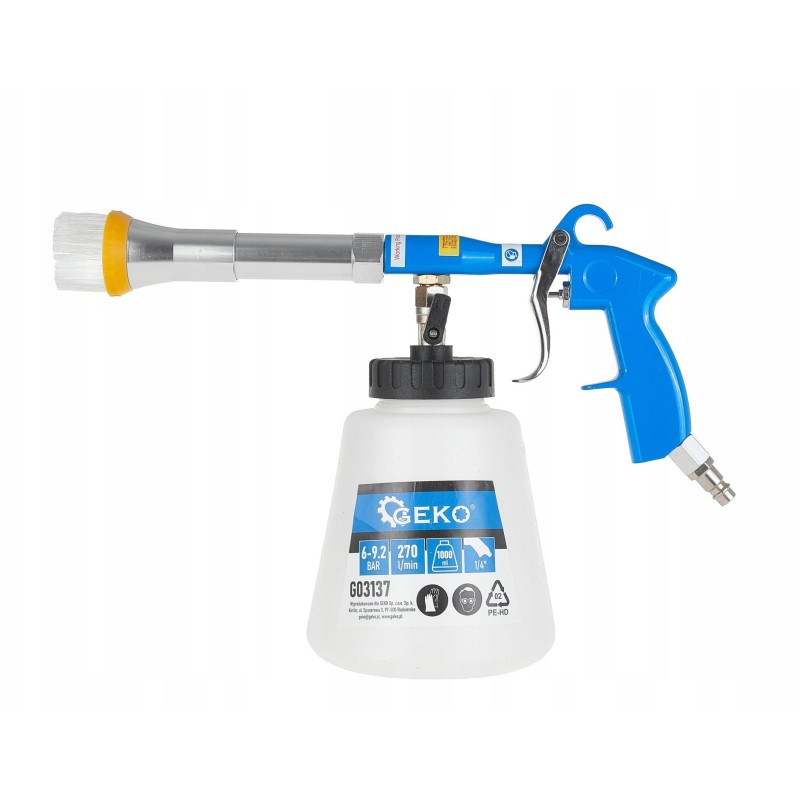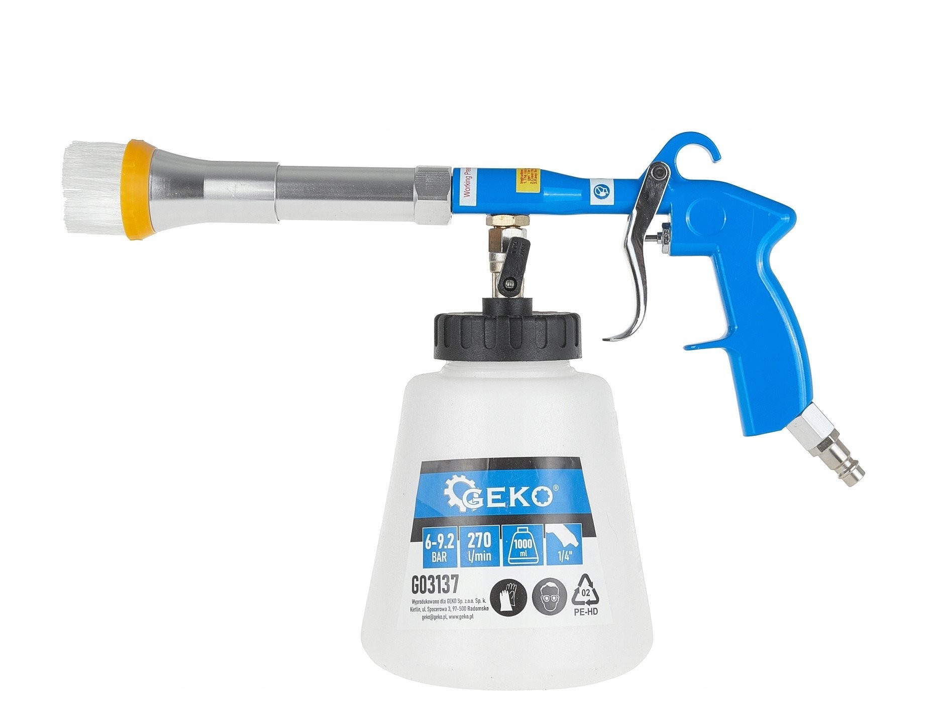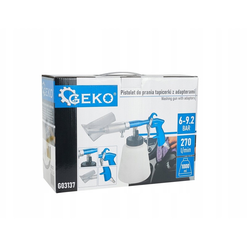 Pistolet do prania tapicerki od marki GEKO to nowoczesne narzędzie, które gwarantuje efektywne czyszczenie tapicerek materiałowych, welurowych, dywaników oraz wykładzin. Dzięki zastosowaniu adapterów, urządzenie z łatwością dociera do trudno dostępnych miejsc, co czyni je idealnym wyborem dla osób, które pragną utrzymać czystość w swoich pojazdach oraz meblach.