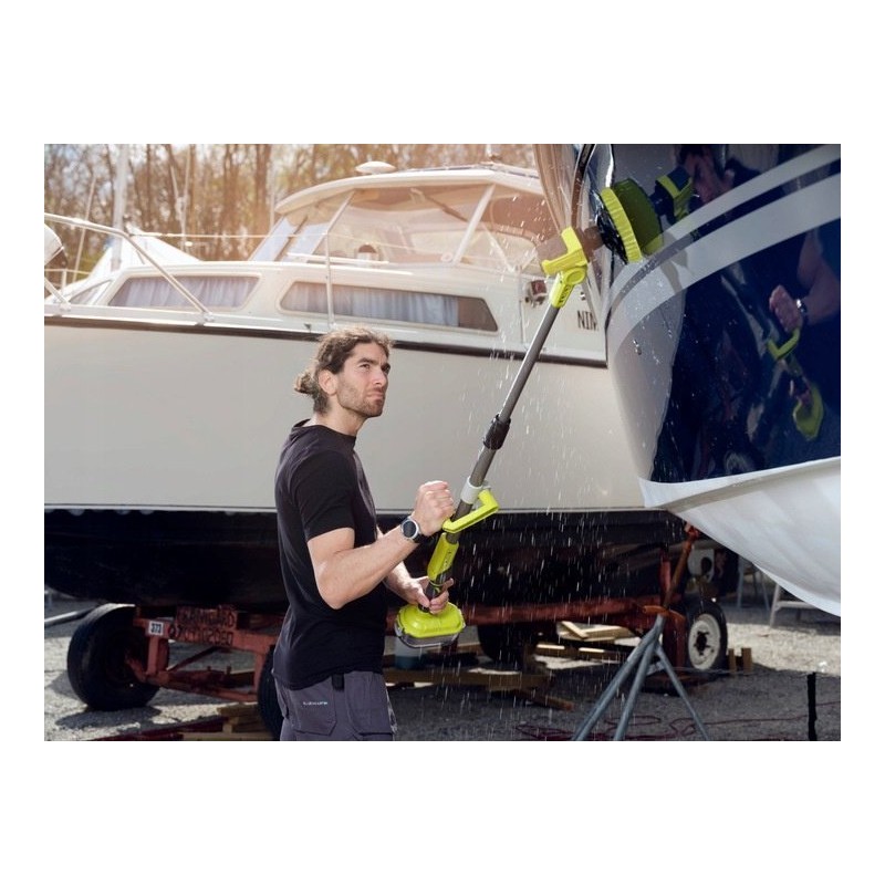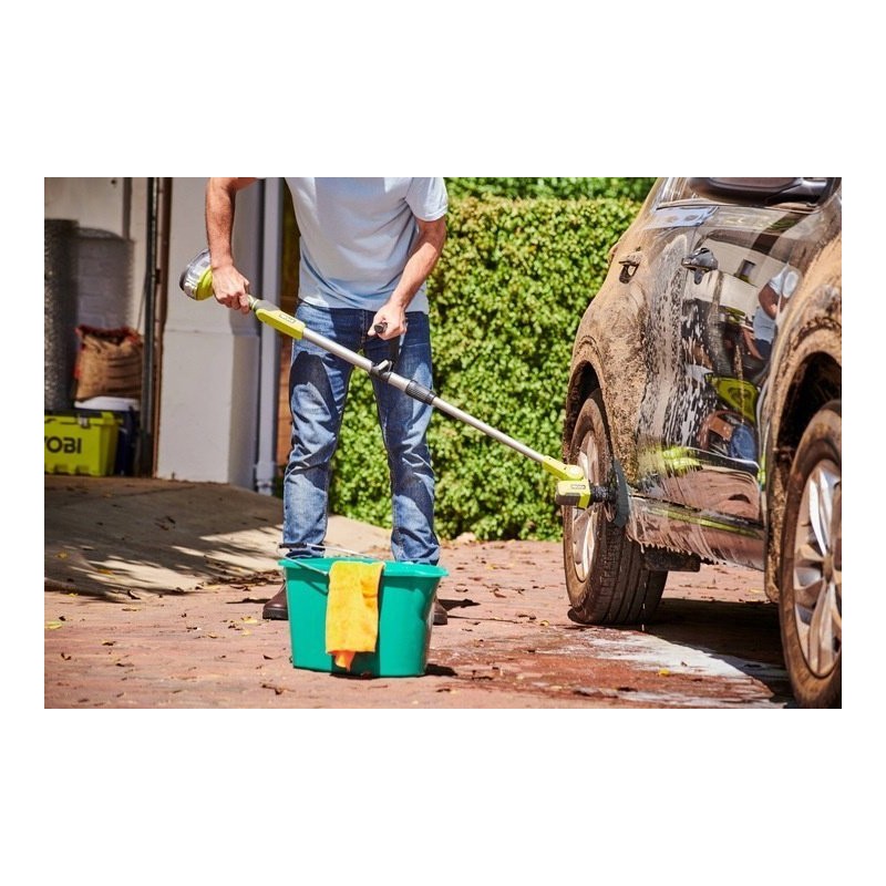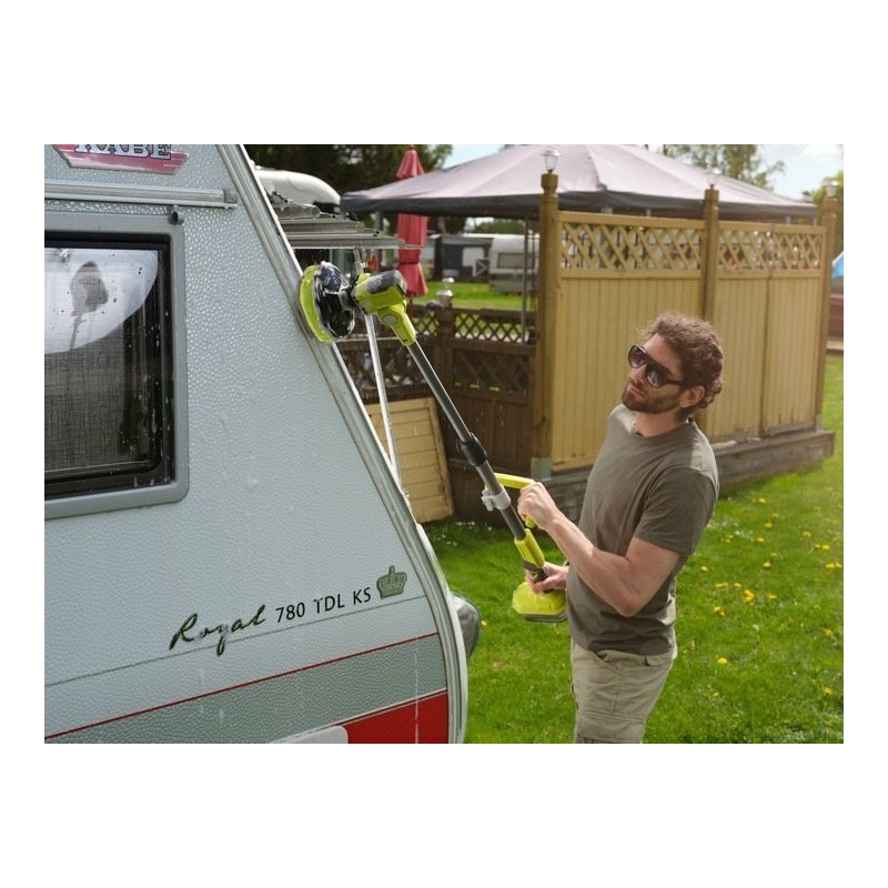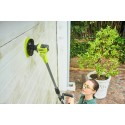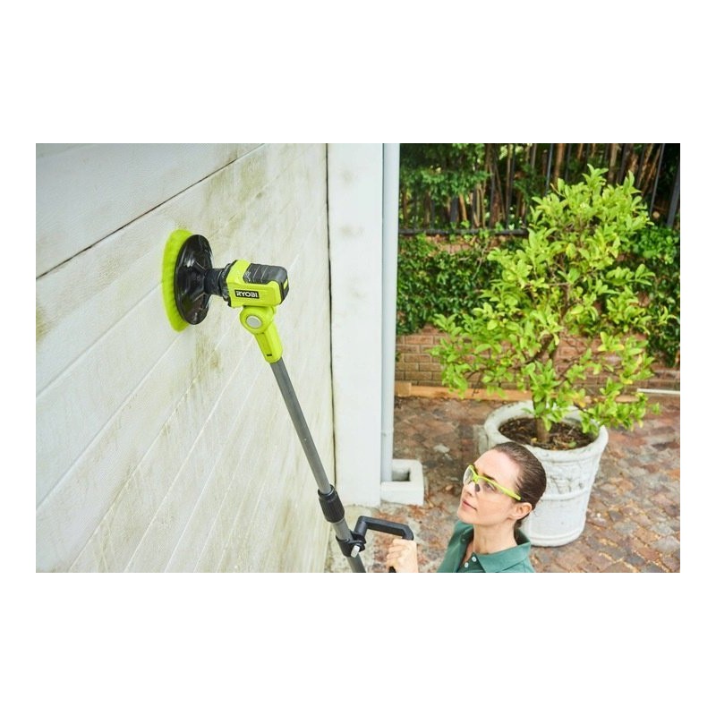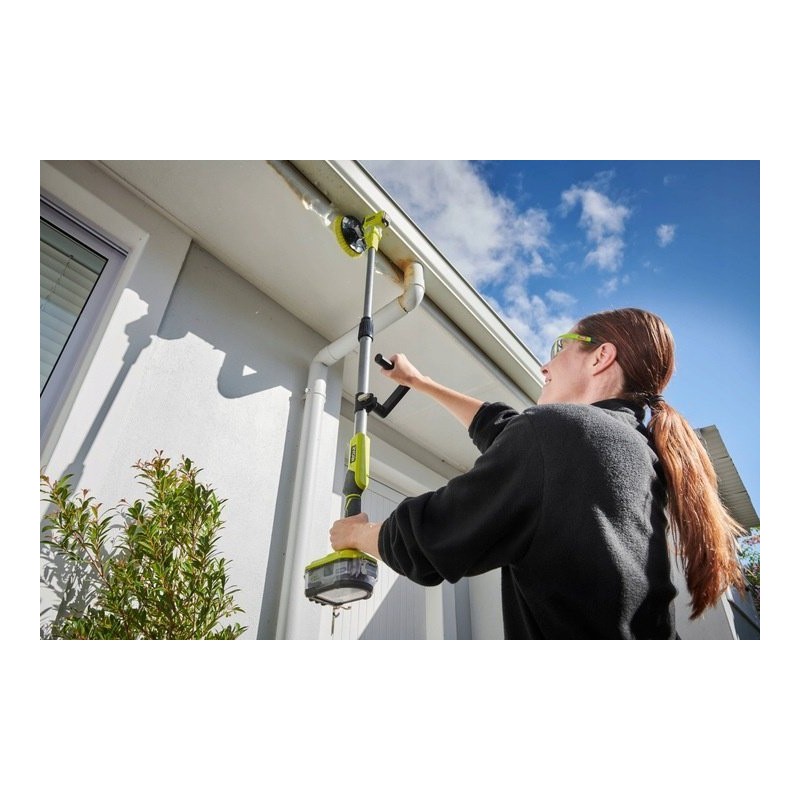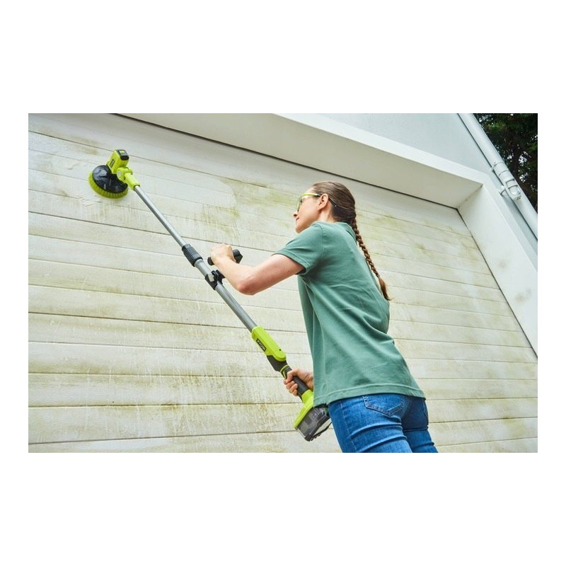 Obrotowa szczotka akumulatorowa Ryobi ONE+ R18TPS na wysięgniku to znakomite rozwiązanie do czyszczenia miejsc znajdujących się poza zasięgiem rąk. Obracająca się z prędkością 210obr./min szczotka o średnicy 15cm skutecznie usuwa nawet uporczywe zabrudzenia znajdujące się na elewacji, blachodachówce czy ścianie garażu.