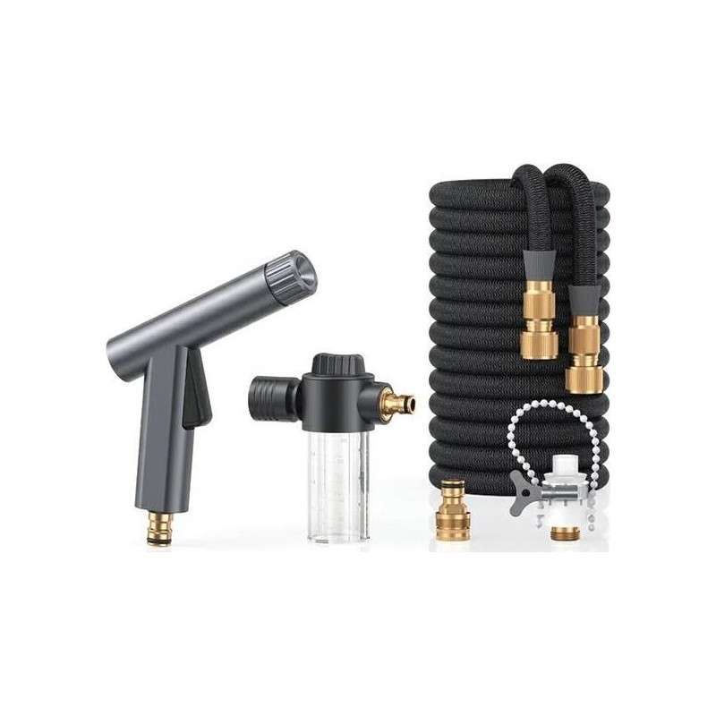 Do zestawu dołączono długi wąż, który rozciąga się do długości aż 15 metrów, dzięki czemu dysza jest bardzo mobilna i pozwala Ci na szeroki zakres działania. Specjalna konstrukcja węża czterokrotnie zwiększa ciśnienie wody, co sprawia, iż tworzy się silny nacisk wody który z łatwością myje samochody przy jednoczesnej ochronie lakieru.
