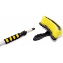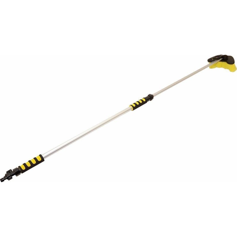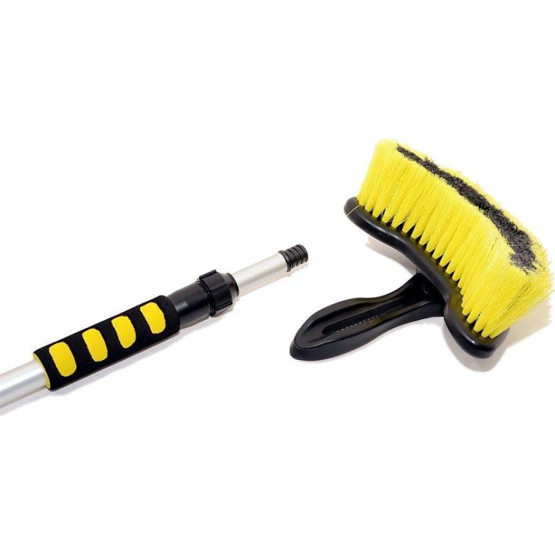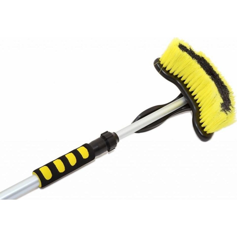Szczotka przepływowa wyposażona jest w 2 wygodne piankowe uchwyty zapewniające wygodną pracę. Połączenie z wężem wodnym rozwiązano za pomocą klasycznej szybkozłączki do węża. Korek wodny znajduje się na końcu pręta. Ponadto samą szczotkę można oddzielić od drążka teleskopowego do osobnego użytku. Dane techniczne: długość: 100 - 170 cm długość włosia pędzla: 6 cm korek na wodę: na szczotce przyłącze wody: szybkozłączka Zawartość opakowania: 1 x szczotka teleskopowa