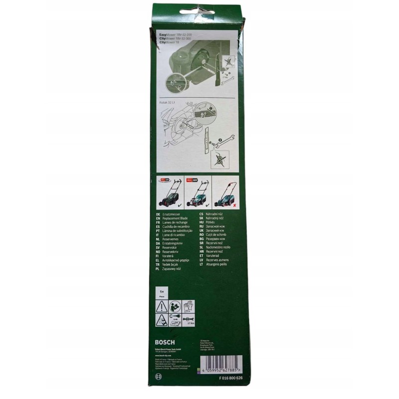 Ten wysokiej jakości nóż jest w pełni kompatybilny z modelami kosiarek EasyMower 18V-32 oraz CityMower 18V-32 marki Bosch, co czyni go idealnym wyborem dla właścicieli tych urządzeń. Wybierając oryginalny nóż Bosch, masz pewność, że Twoja kosiarka będzie działać na najwyższych obrotach.