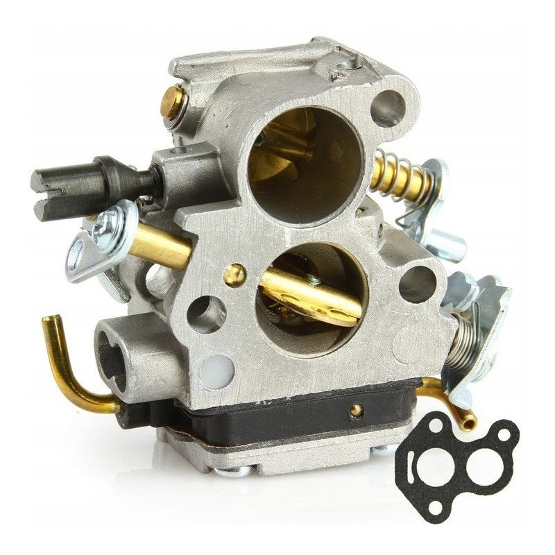 W zestawie z gaźnikiem znajduje się uszczelka, która jest niezbędna do prawidłowego montażu. Uszczelka ta zapewnia szczelność połączeń, co jest kluczowe dla uniknięcia wycieków paliwa oraz poprawy wydajności pracy silnika. Dzięki temu użytkownicy mogą być pewni, że ich piła będzie działać w optymalnych warunkach.