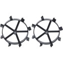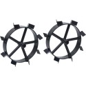 Zestaw mocnych, metalowych kółek jest przeznaczony do użytku z naszą glebogryzarką spalinową o mocy 6,5 KM. Kółka metalowe z zębami chwytnymi stanowią części zamienne dla kół glebogryzarki do ustabilizowania maszyny podczas pracy w mokrym środowisku i zapobiegania jej ślizganiu się.