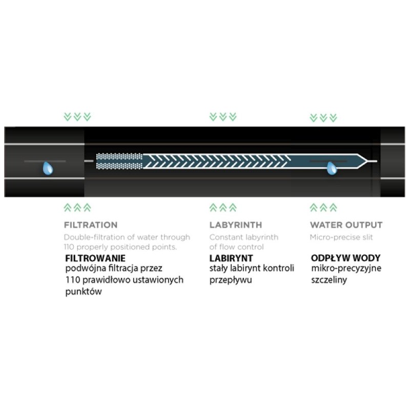 - Kroplowniki, posiadające unikalny labirynt, zapewniają niewielki spadek przepływu wody wraz ze wzrostem długości taśmy