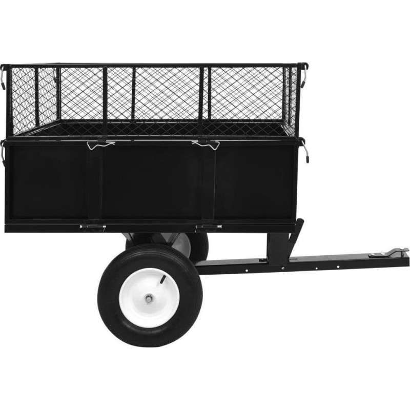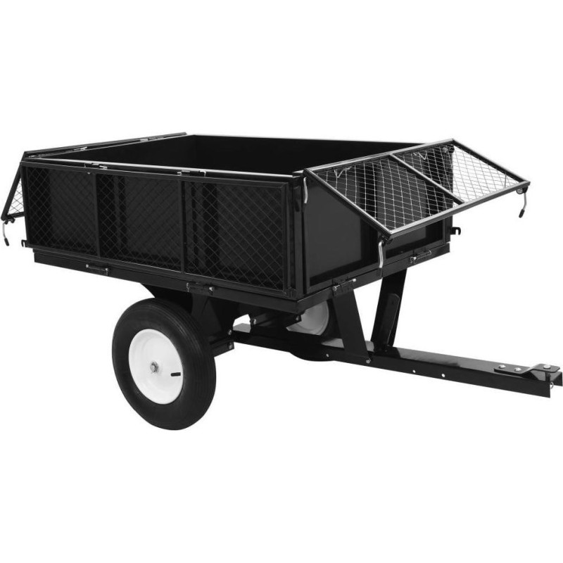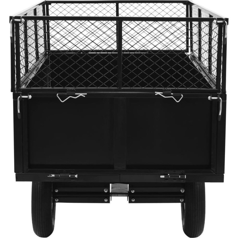 Ta przyczepka ogrodowa ma ładowność do 300 kg. Wysokość można zwiększyć o 30 cm, a ściany boczne złożyć i odchylić. Dołączono do niej uniwersalny zaczep do mocowania wózków (za pomocą śrub).