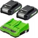 Greenworks 24V Zestaw startowy GSK24B2X z 2 akumulatorami 2Ah i ładowarką uniwersalną (Li-Ion 24V 2Ah output 48W/2A pasujące do wszystkich urządzeń i akumulatorów z serii 24V oraz 2x24V Greenworks)