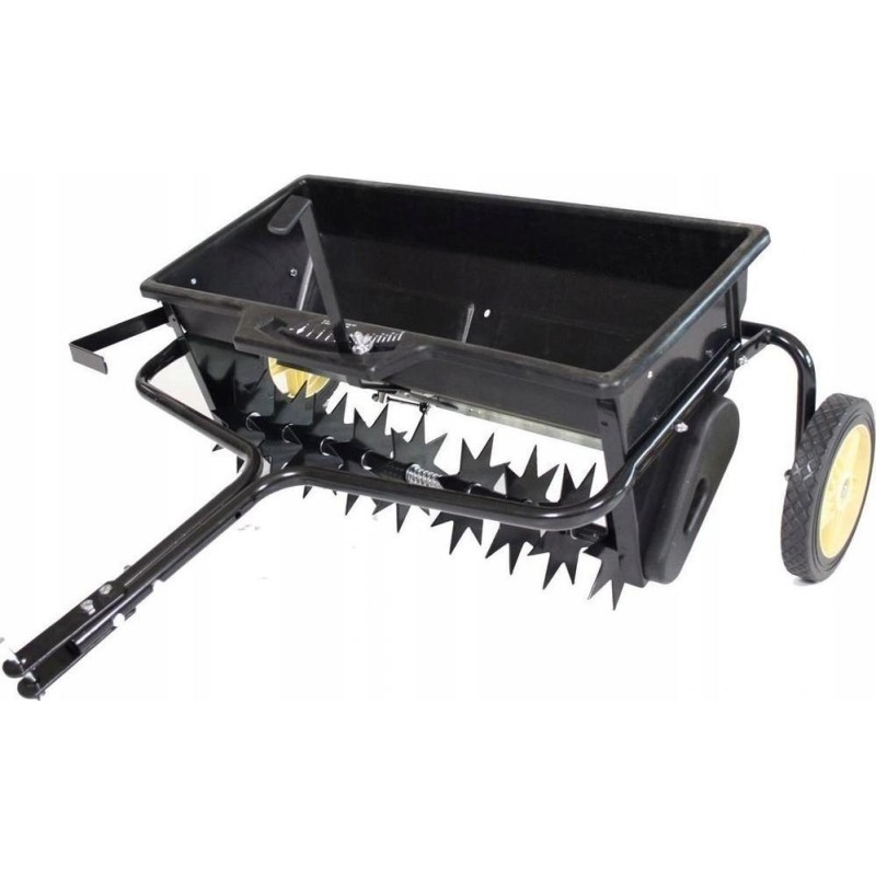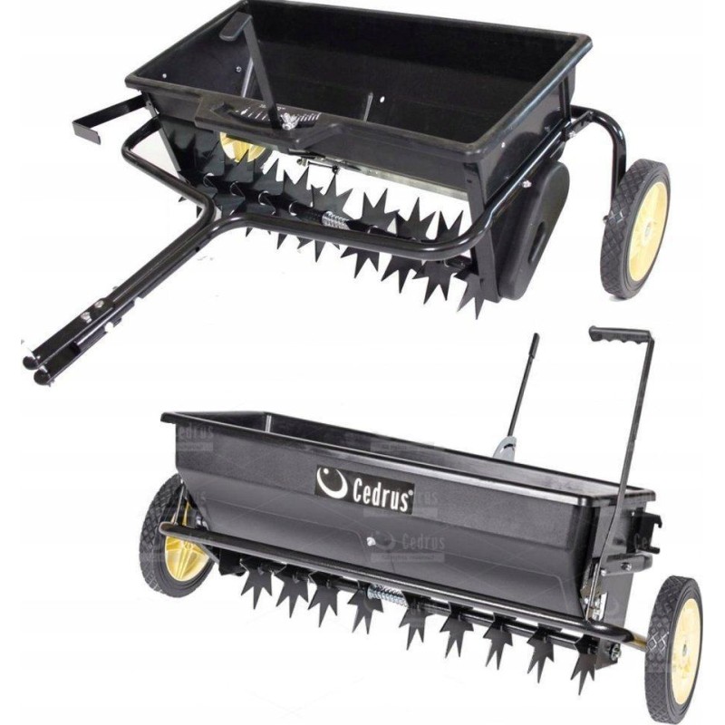 CEDRUS SP31509 Aerator - rozrzutnik służy do podłączenia do traktorka ogrodowego i pozwala na jednoczesne napowietrzanie i nawożenie trawnika. Dwa koła transportowe pozwalają na swobodne przemieszczanie pomiędzy obszarami pracy.
