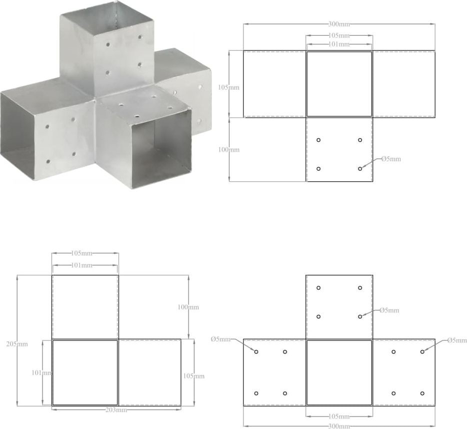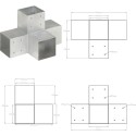 Elektrogalwanizowany łącznik umożliwia łatwe łączenie i stabilizację belek. Wszystkie łączniki mają fabrycznie nawiercone otwory. Łącznik ten jest przeznaczony do 4 kwadratowych belek drewnianych o grubości 101 mm.