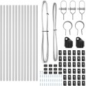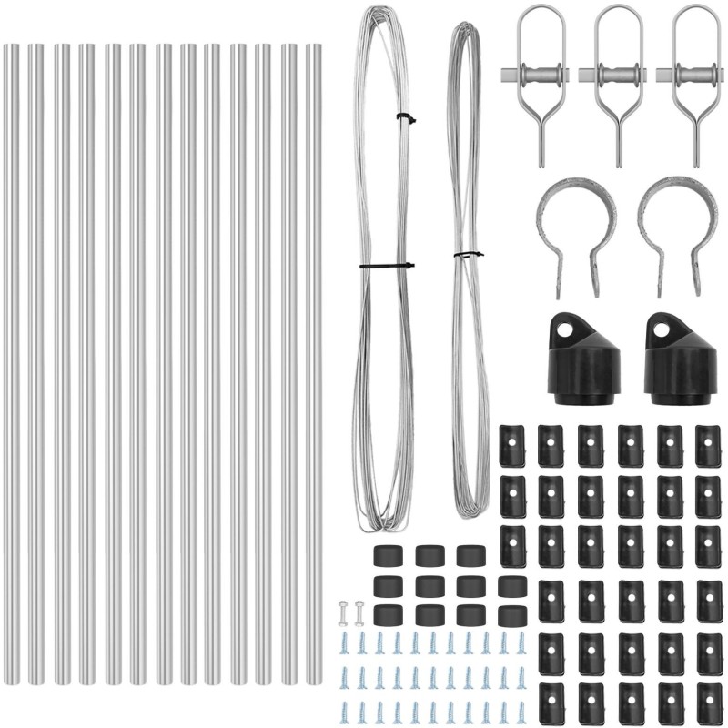 - Delivery Contains: 11 x Słupek, 2 x Słupek kątowy, 11 x Plastikowa nakrętka, 33 x Wsparcie na plastikowy drut napinający, 2 x Nakrętka dla słupka kątowego, 2 x Elementy montażowe słupka kątowego, 3 x Napinacz, 1 x 25 m Drut wiążący, 1 x 80 m Drut napinający