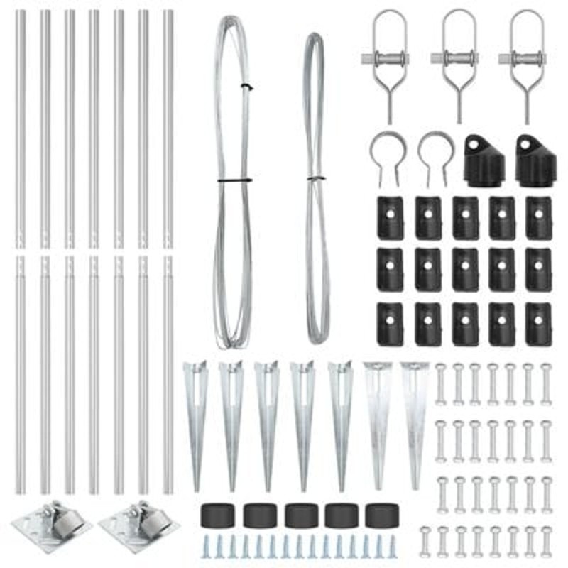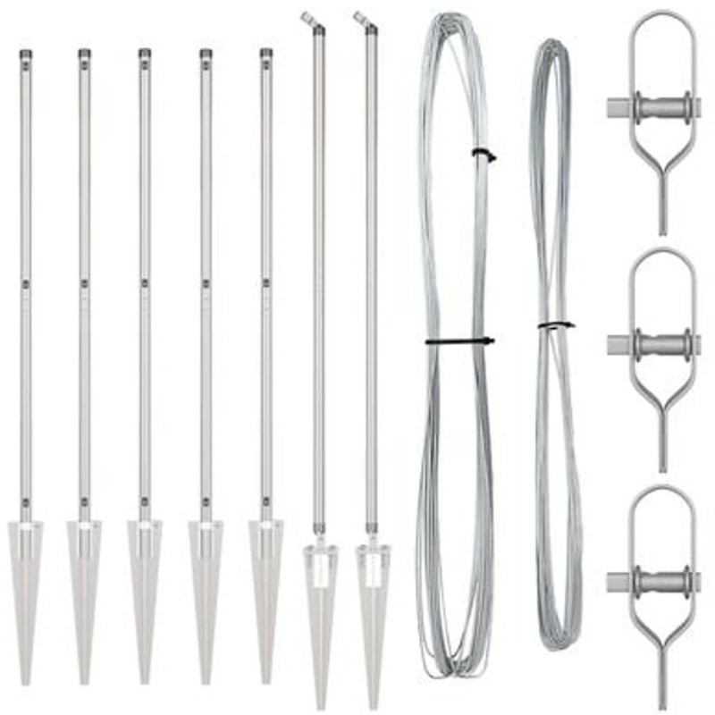 - Wysyłka zawiera: 5 x Słup, 2 x Słup kątowy, 5 x Szpilka, 2 x Szpilka kątowa, 5 x Kap, 15 x Wsparcie napinacza z plastiku, 15 x Śruba w plastikowym wsparciu, 2 x Wieczko słupa kątowego, 2 x Akcesoria słupa kątowego, 3 x Napinacz, 1 x 25m drut wiążący, 1 x 33m drut napinający