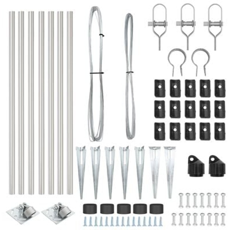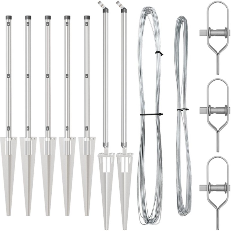 - Delivery Contains: 5 x Post, 2 x Angle Post, 5 x Spike, 2 x Angle Spike, 5 x Plastic Cap, 15 x Plastic Tension Wire Supporter, 15 x Crew on the Plastic Supporter, 2 x Angle Post Cap, 2 x Angle Post Hardware, 3 x Tensioner, 1 x 25m binding wire, 1 x 33m tension wire