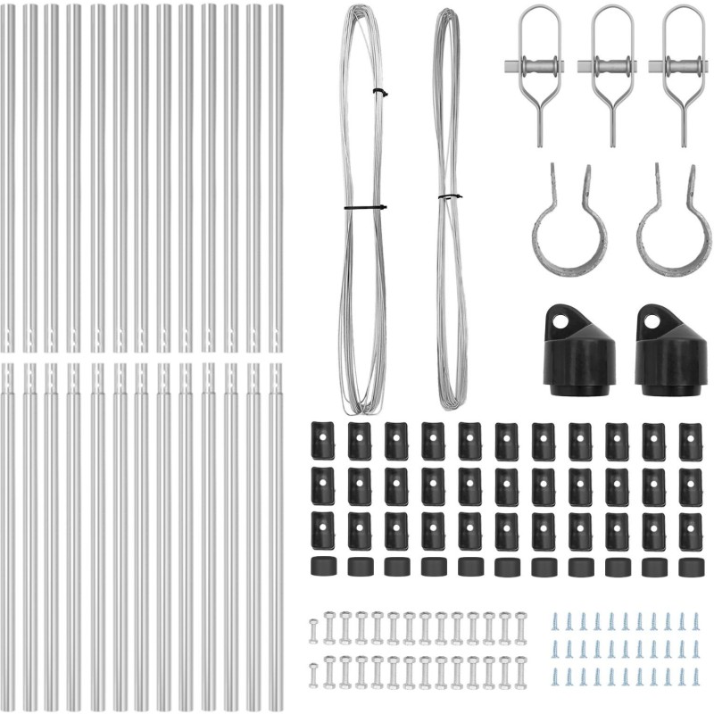 - Delivery Contains: 11 x Słupek, 2 x Słupek kątowy, 11 x Plastikowa nasadka, 33 x Plastikowe wsparcie druciane, 2 x Nasadka kątowa, 2 x Akcesoria kątowe, 3 x Napinacz, 1 x 25m Drut wiążący, 1 x 80m Drut napinający