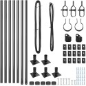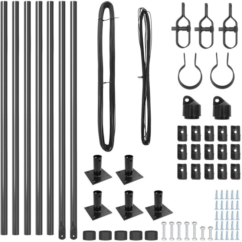 - Delivery Contains: 5 x Słup, 2 x Słup kątowy, 5 x Podstawa, 5 x Plastikowa nasadka, 15 x Plastikowy wspornik drutu naciągowego, 2 x Nasadka słupa kątowego, 2 x Akcesoria słupa kątowego, 3 x Naciągacz, 1 x 25 m Drut wiążący, 1 x 33 m Drut naciągowy