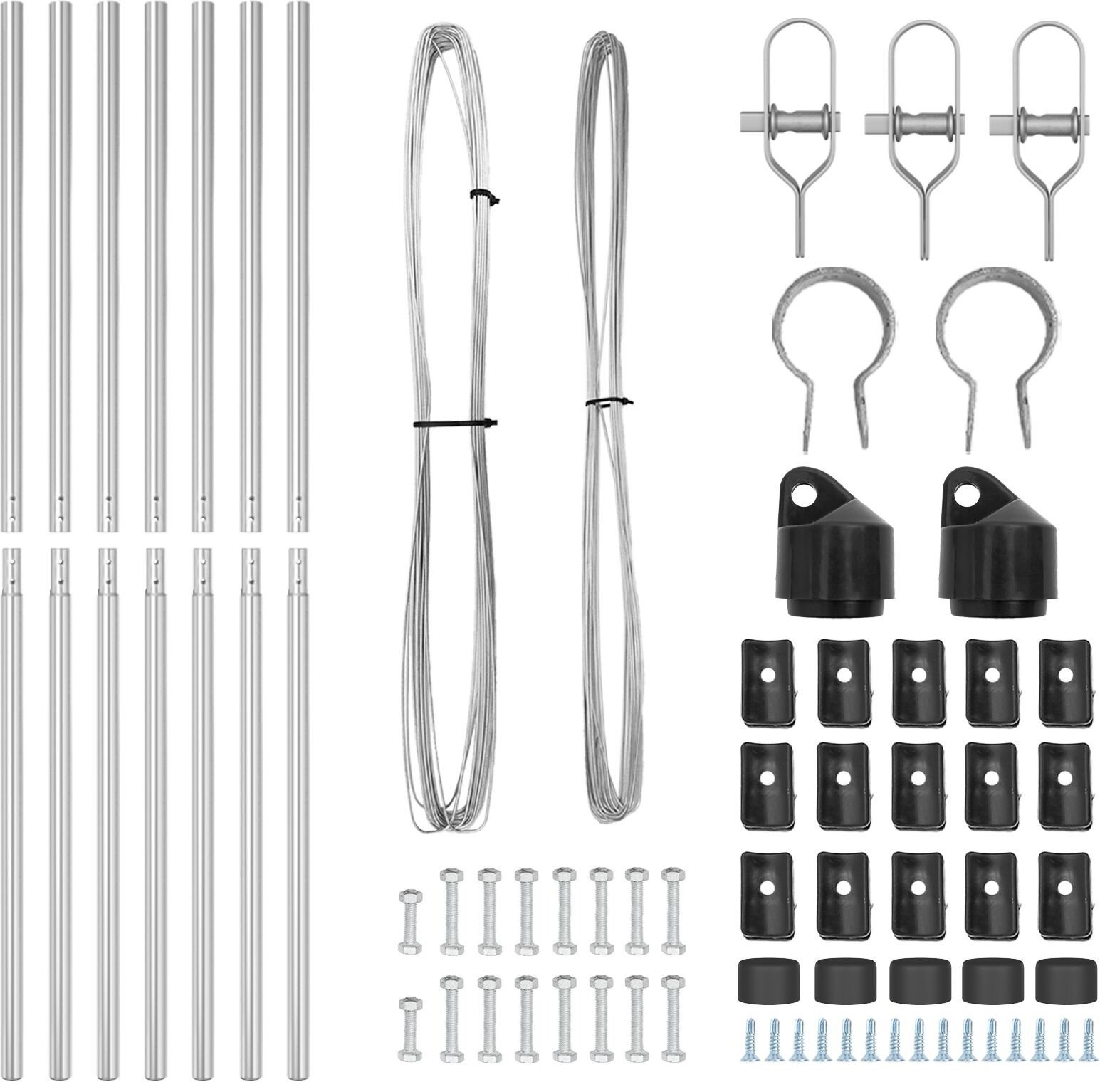- Delivery Contains: 11 x słup, 2 x słup kątowy, 11 x plastikowa końcówka, 33 x plastikowy wspornik napinający, 2 x końcówka kątowa, 2 x elementy mocowania kątowego, 3 x zacisk, 1 x 25m drut wiążący, 1 x 80m drut napinający