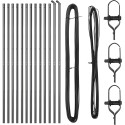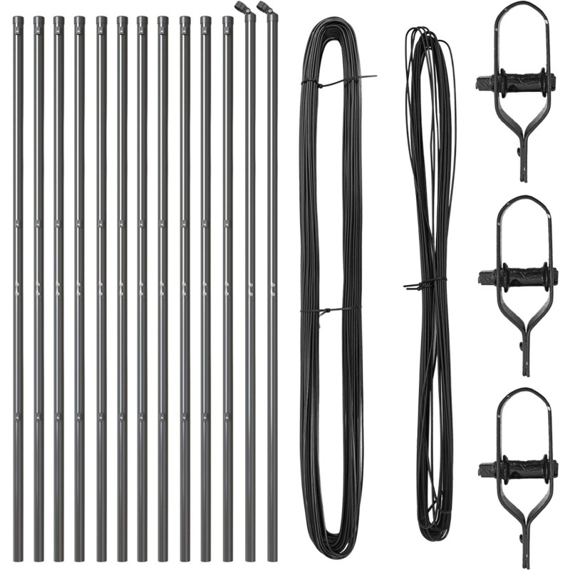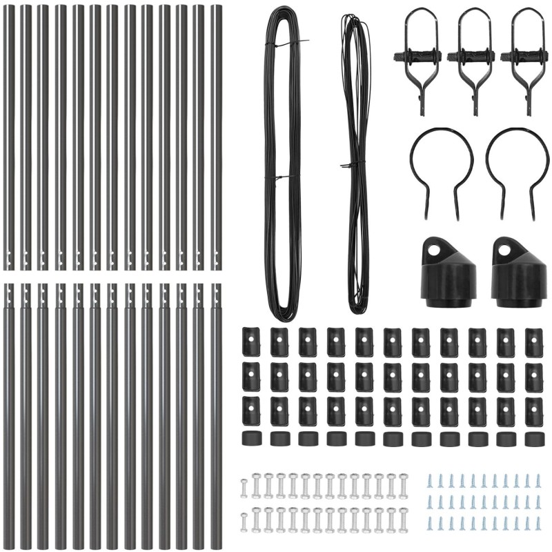 - Delivery Contains: 11 x Słupek, 2 x Słupek kątowy, 11 x Plastikowa nakrywka, 33 x Plastikowy wspornik drutu napinającego, 2 x Nakrywka słupka kątowego, 2 x Materiał do słupka kątowego, 3 x Napinacz, 1 x 25 m Drut wiążący, 1 x 80 m Drut napinający