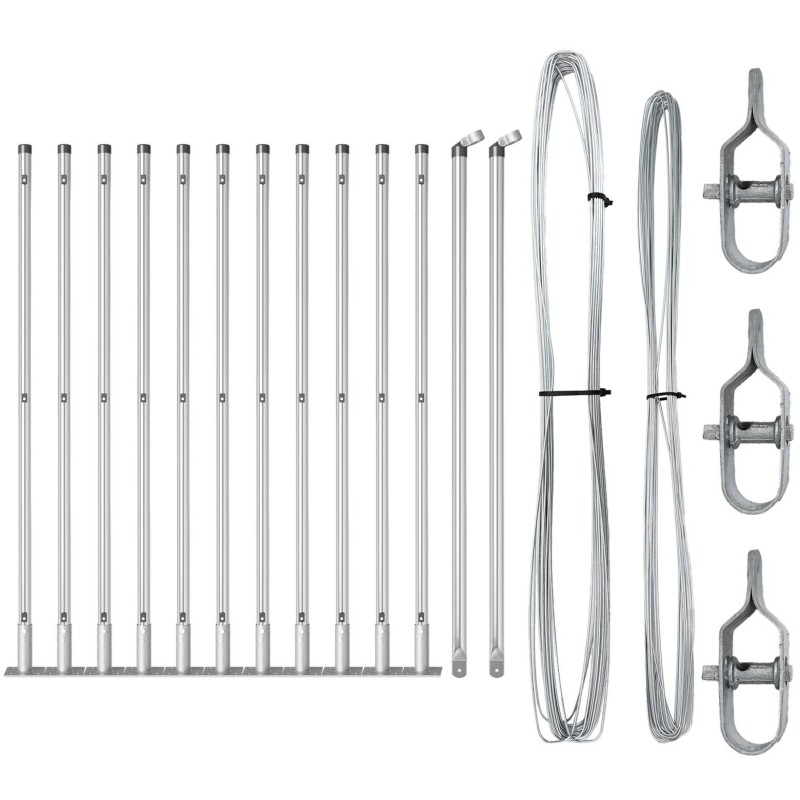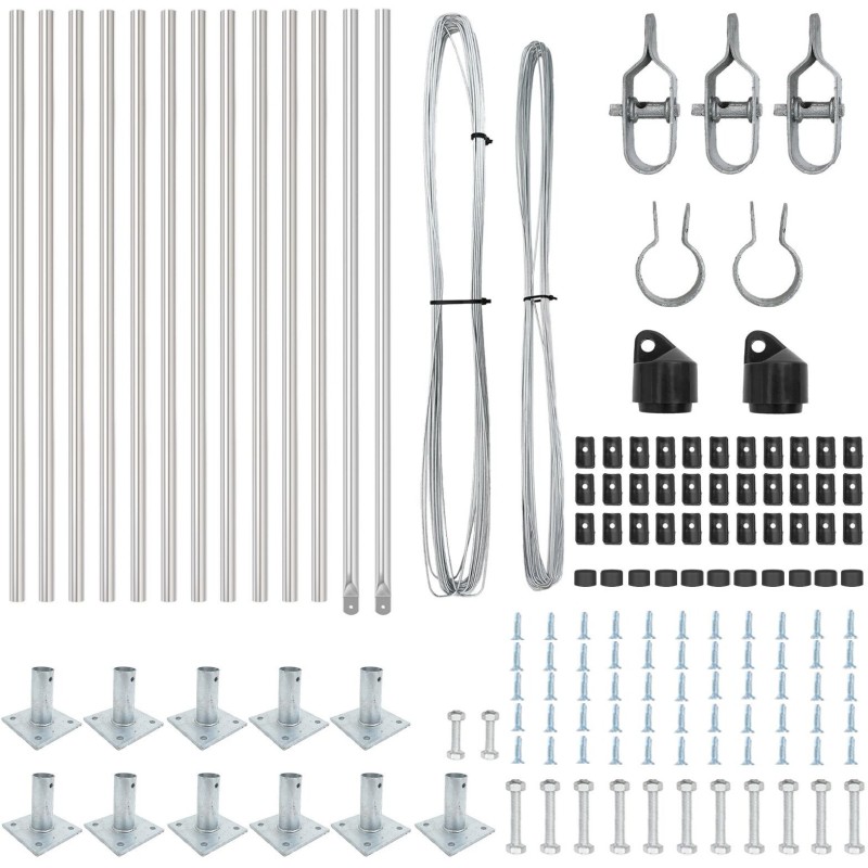 - Delivery Contains: 11 x słupek, 2 x słupek kątowy, 11 x podstawa, 11 x plastikowa nakrętka, 33 x plastikowy wspornik drutu napinającego, 2 x czapka słupka kątowego, 2 x elementy do słupa kątowego, 3 x napinacz, 1 x 25 m drut wiążący, 1 x 80 m drut napinający