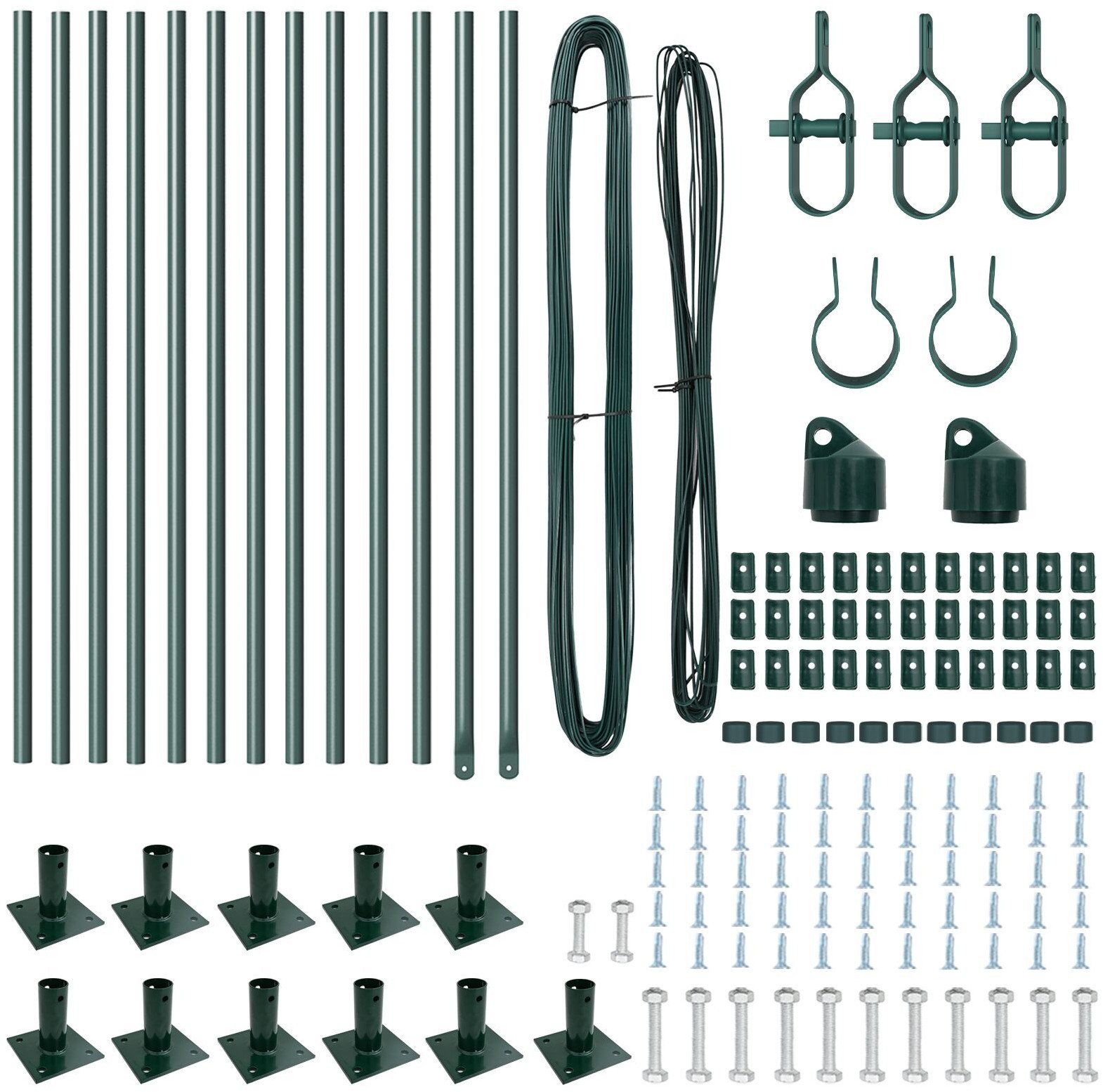 - Delivery Contains: 11 x słup, 2 x słup kątowy, 11 x płyta podstawy, 11 x plastikowa nakrywka, 33 x wsparcie na napięcie plastikowe, 2 x nakrywka słupa kątowego, 2 x akcesoria do słupa kątowego, 3 x napięcie, 1 x 25 m drut wiążący, 1 x 80 m drut napięciowy