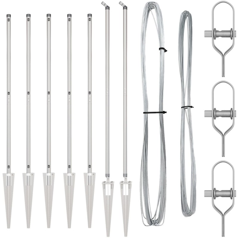 - Delivery Contains: 5 x Post, 2 x Angle Post, 5 x Spike, 2 x Angle Spike, 5 x Plastic Cap, 15 x Plastic Tension Wire Supporter, 15 x Crew on the Plastic Supporter, 2 x Angle Post Cap, 2 x Angle Post Hardware, 3 x Tensioner, 1 x 25m binding wire, 1 x 33m tension wire