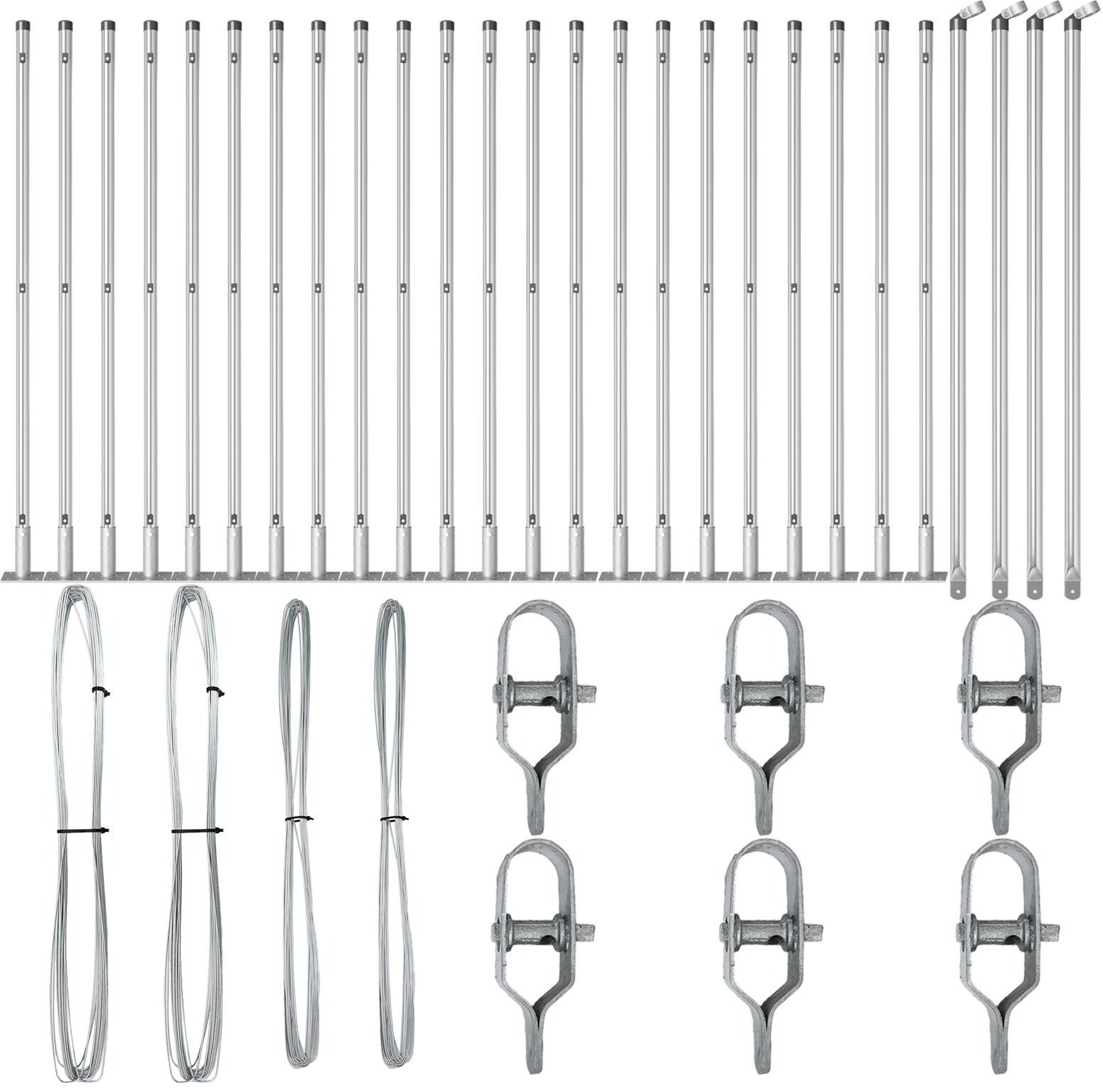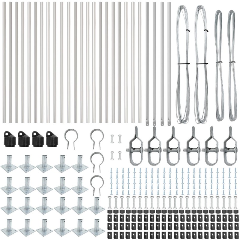 - Delivery Contains: 22 x słup, 4 x słup kątowy, 22 x podstawka, 22 x plastikowa nasadka, 66 x plastikowy wspornik drutu naciągowego, 4 x nasadka słupa kątowego, 4 x sprzęt do słupa kątowego, 6 x napinacz, 2 x 25 m drutu wiążącego, 2 x 80 m drutu naciągowego
