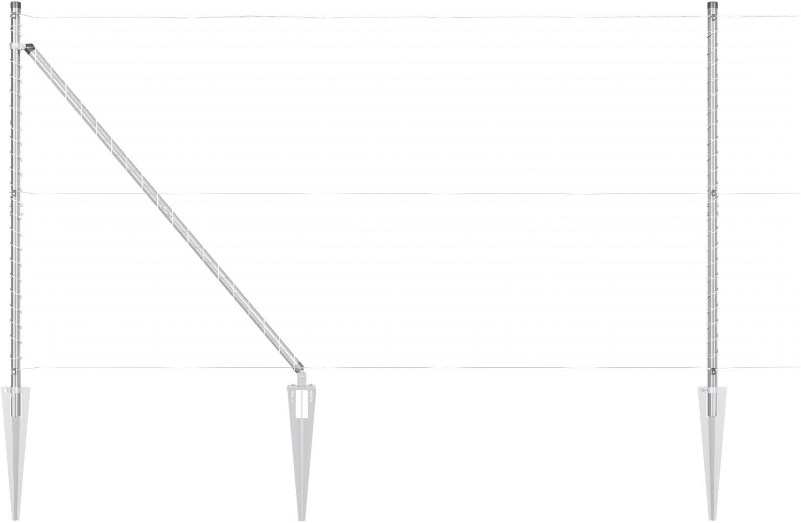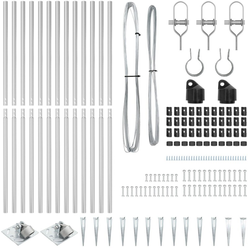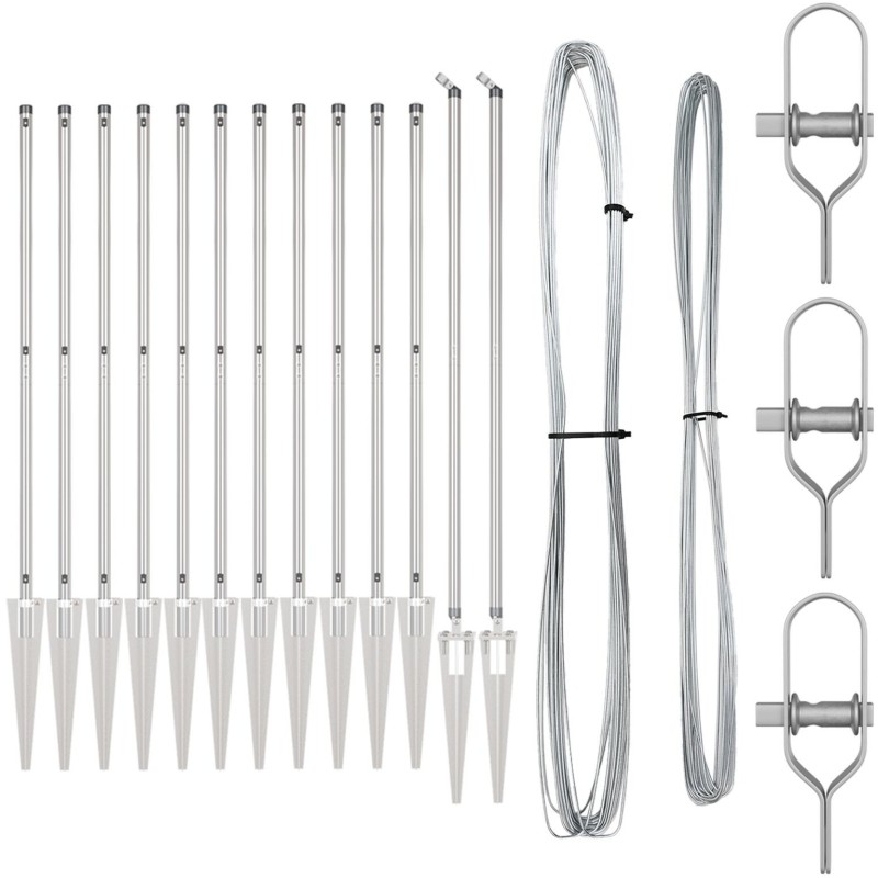 - Delivery Contains: 11 x Słupek, 2 x Słupek kątowy, 11 x Gwoźdź, 2 x Gwoźdź kątowy, 11 x Plastikowa nakładka, 33 x Plastikowy wspornik drutu, 33 x Śruba na wsporniku, 2 x Nakładka na słupki kątowe, 2 x Akcesoria do kątowych słupków, 3 x Napinacz, 1 x 25m drut wiążący, 1 x 80m drut napinający
