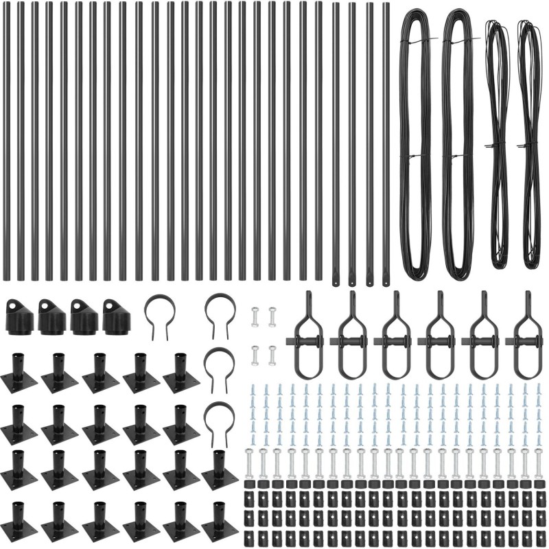 - Delivery Contains: 22 x Słupek, 4 x Słupek kątowy, 22 x Płyta podstawowa, 22 x Pokrywa plastikowa, 66 x Plastikowy wspornik napięcia, 4 x Pokrywa słupka kątowego, 4 x Akcesoria do słupka kątowego, 6 x Napięcie, 2 x 25 m Drut wiążący, 2 x 80 m Drut napięcia