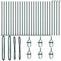 - Co znajduje się w zestawie: Zestaw zawiera 22 słupy, 4 słupy kątowe, płyty podstawowe, plastikowe nakrętki, wsparcia drutu napinającego, nakrętki słupa kątowego, napinacze, drut wiążący i drut napinający, co zapewnia wszystko potrzebne do montażu.
