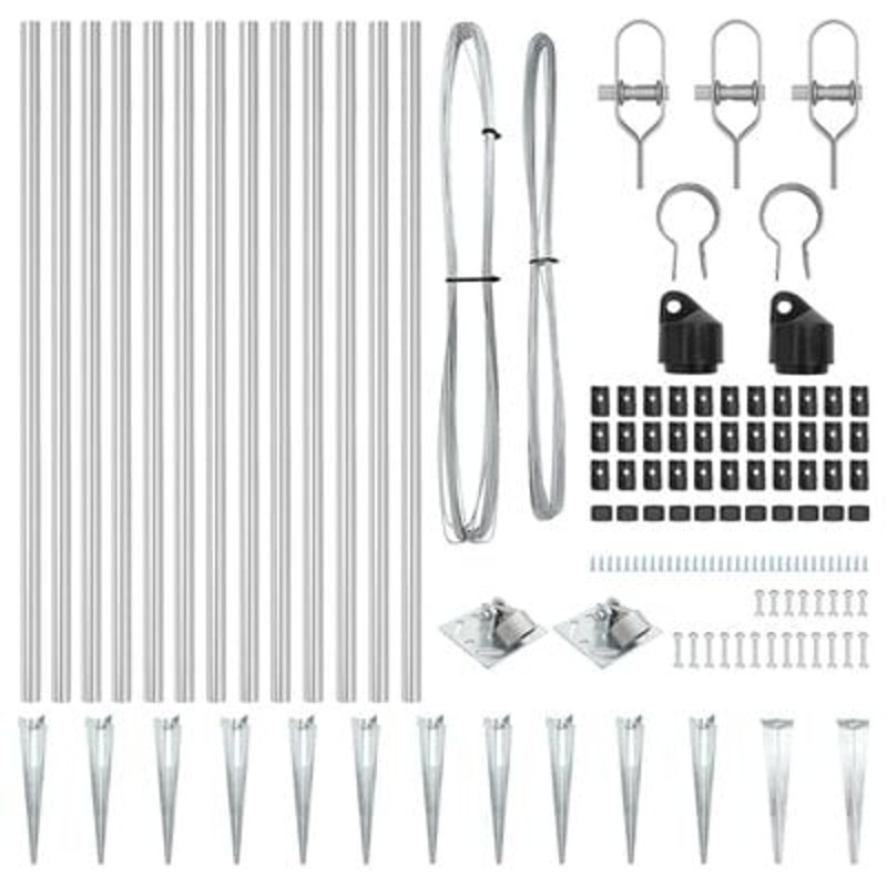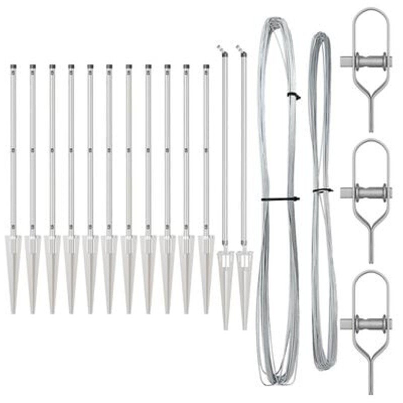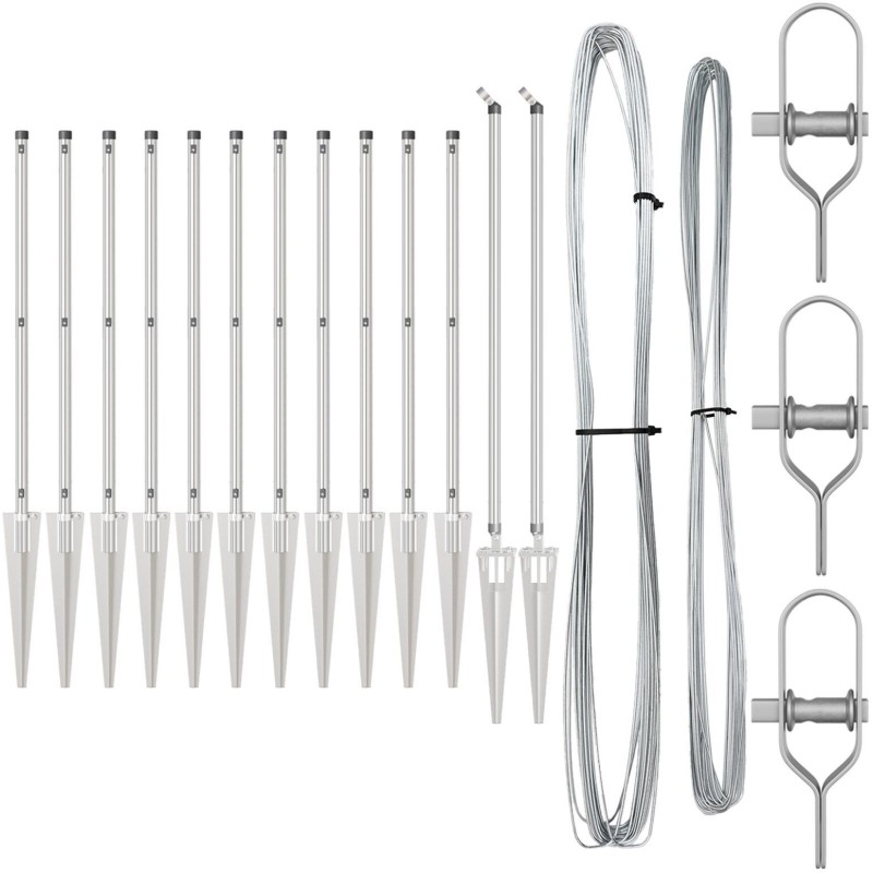 - Delivery Contains: 11 x Post, 2 x Angle Post, 11 x Spike, 2 x Angle Spike, 11 x Plastic Cap, 33 x Plastic Tension Wire Supporter, 33 x Crew on the Plastic Supporter, 2 x Angle Post Cap, 2 x Angle Post Hardware, 3 x Tensioner, 1 x 25m Binding Wire, 1 x 80m Tension Wire