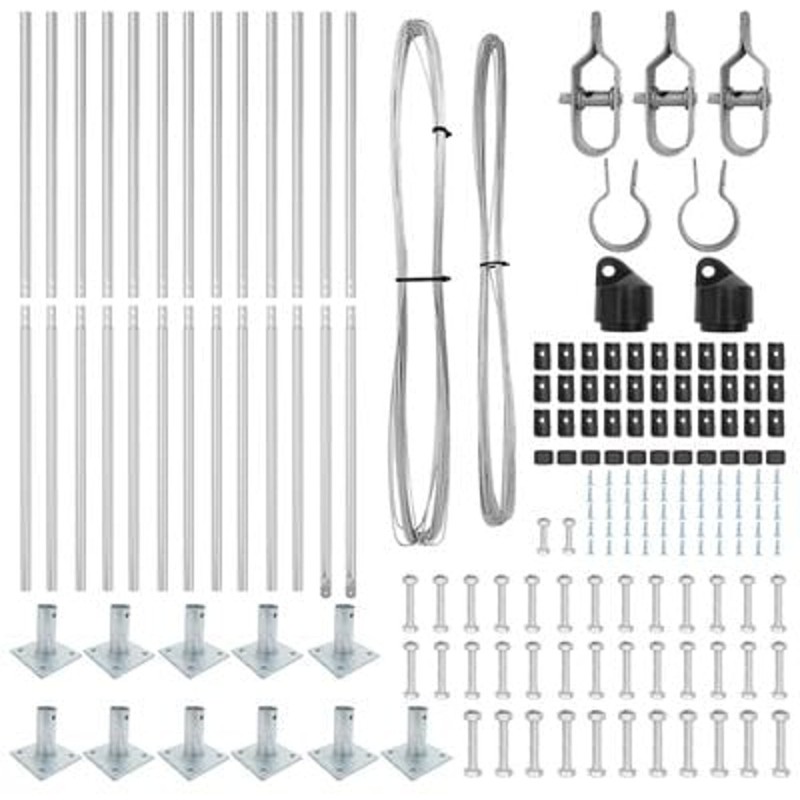 - Dostarczane zawiera: 11 x Słup, 2 x Słup kątowy, 11 x Płyta podstawowa, 11 x Osłona plastikowa, 33 x Wspornik drutu naciągowego, 2 x Osłona słupa kątowego, 2 x Elementy materiału dla słupa kątowego, 3 x Napinacz, 1 x 25 m Drut wiążący, 1 x 80 m Drut naciągowy
