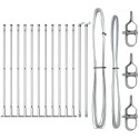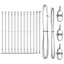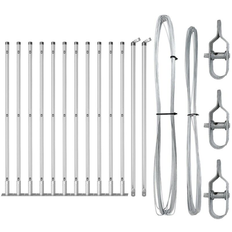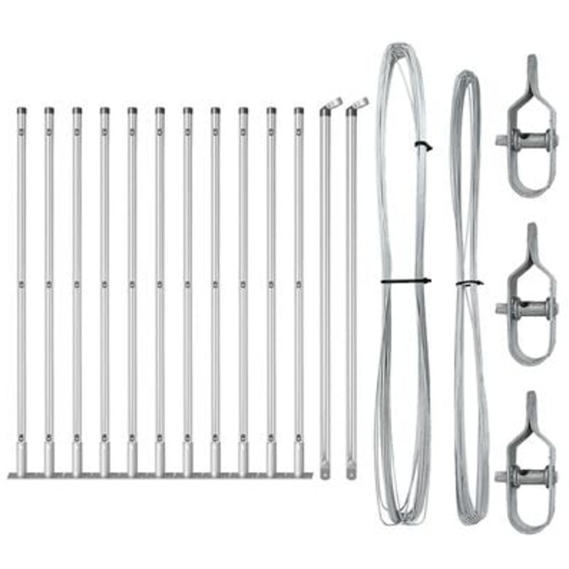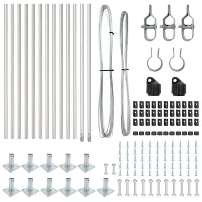 - Co dostarczono: 11 x Słup, 2 x Słup kątowy, 11 x Płyta podstawowa, 11 x Plastikowa nakrętka, 33 x Plastikowy wspornik drutu naciągowego, 2 x Nakrętka słupa kątowego, 2 x Elementy słupa kątowego, 3 x Napięcie, 1 x 25 m drutu wiążącego, 1 x 80 m drutu naciągowego
