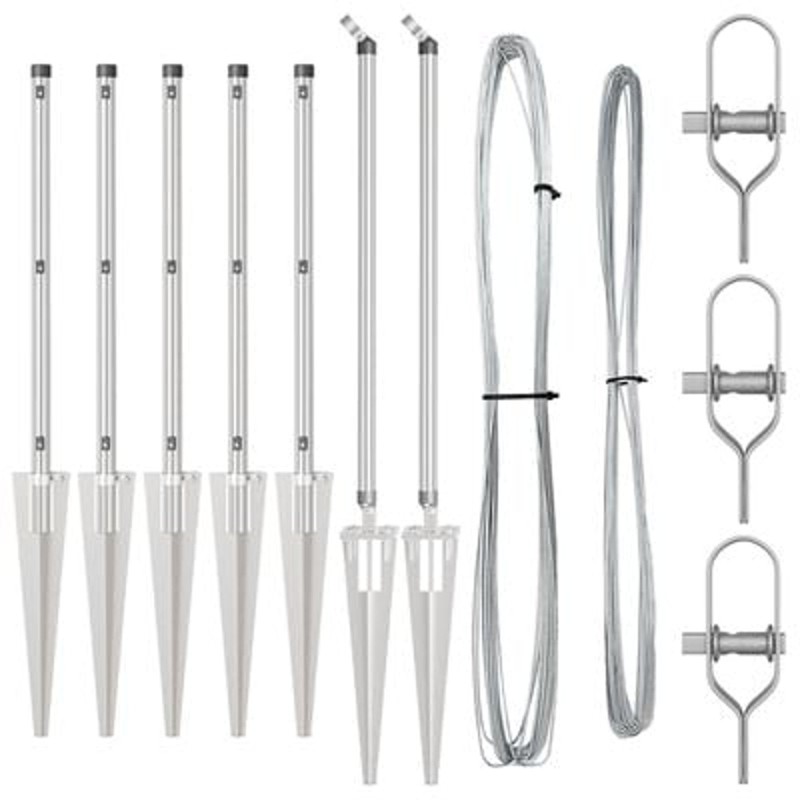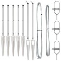 - Dostarczane elementy: 5 x słup, 2 x słup kątowy, 5 x szpikulec, 2 x szpikulec kątowy, 5 x plastikowa nakrywka, 15 x plastikowe wsparcie ciśnieniowe, 15 x wkręt w plastikowym wsparciu, 2 x nakrywka słupa kątowego, 2 x akcesoria słupa kątowego, 3 x napinacz, 1 x 25m drut wiążący, 1 x 33m drut napinający