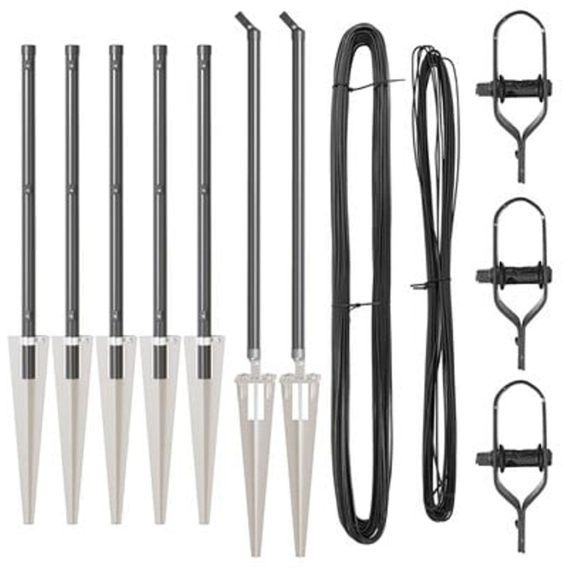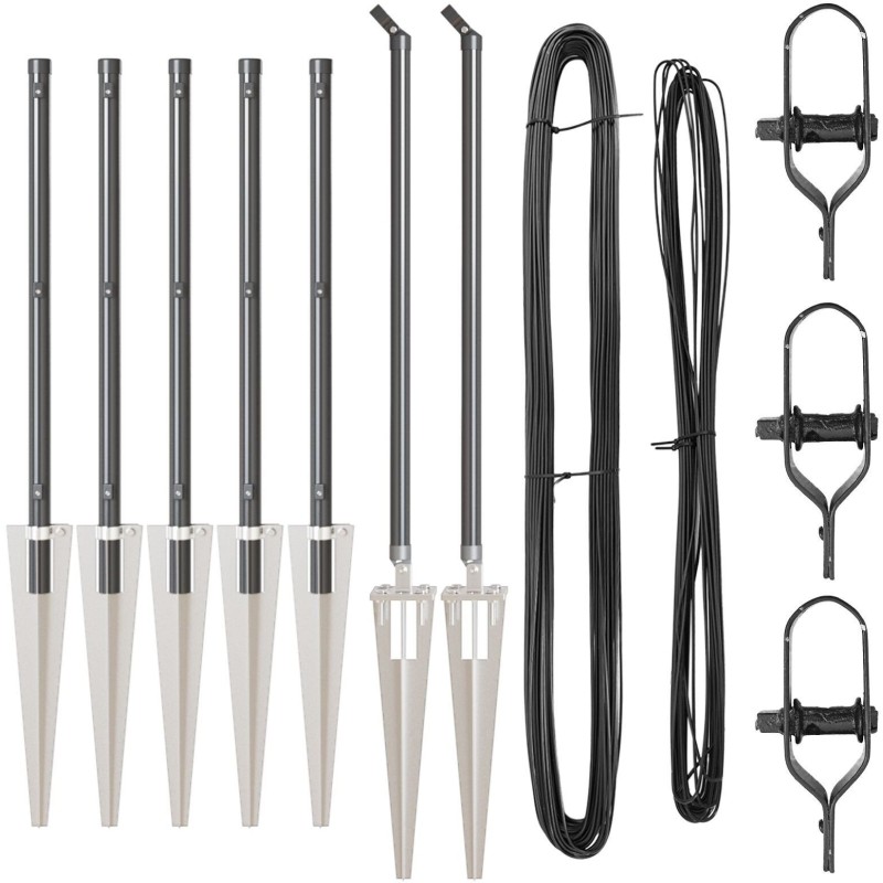 - Delivery Contains: 5 x Post, 2 x Angle Post, 5 x Spike, 2 x Angle Spike, 5 x Plastic Cap, 15 x Plastic Tension Wire Supporter, 15 x Crew on the Plastic Supporter, 2 x Angle Post Cap, 2 x Angle Post Hardware, 3 x Tensioner, 1 x 25m binding wire, 1 x 33m tension wire
