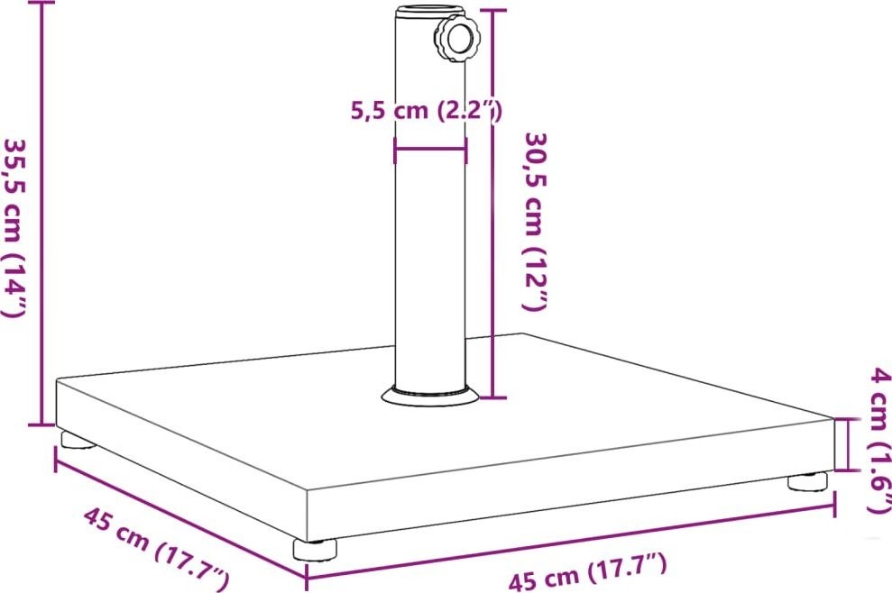 - Mocna i stabilna podstawa: ta podstawa do parasola ma trwałą obudowę ze stali wypełnioną betonem, co zapewnia wyjątkową stabilność. Dzięki temu parasol będzie solidnie zamocowany i nie przewróci się nawet przy wietrze.