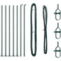 - W zestawie: 5 x słupek, 2 x słupek kątowy, 5 x podstawa, 5 x nakładka plastikowa, 15 x wsparcie drutu napinającego, 2 x nakładka na słupek kątowy, 2 x okucia na słupek kątowy, 3 x napinacz, 1 x 25 m drut związujący, 1 x 33 m drut napinający