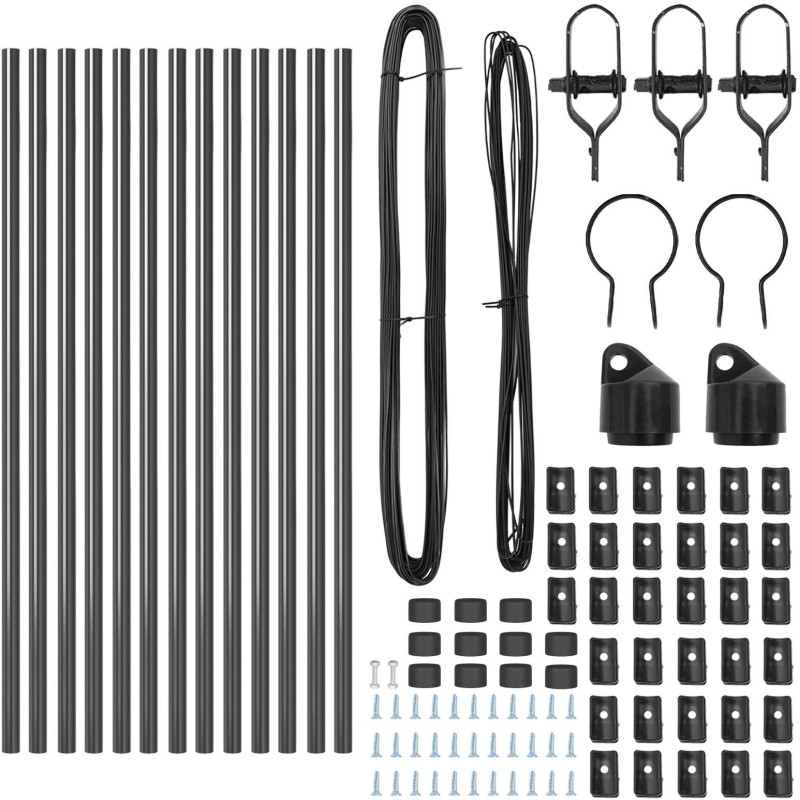 - Delivery Contains: 11 x Słup, 2 x Słup kątowy, 11 x Plastikowa osłona, 33 x Plastikowe wsparcie z drutu napinającego, 2 x Osłona słupa kątowego, 2 x Elementy mocujące słupa kątowego, 3 x Napinacz, 1 x 25 m Drut wiążący, 1 x 80 m Drut napinający